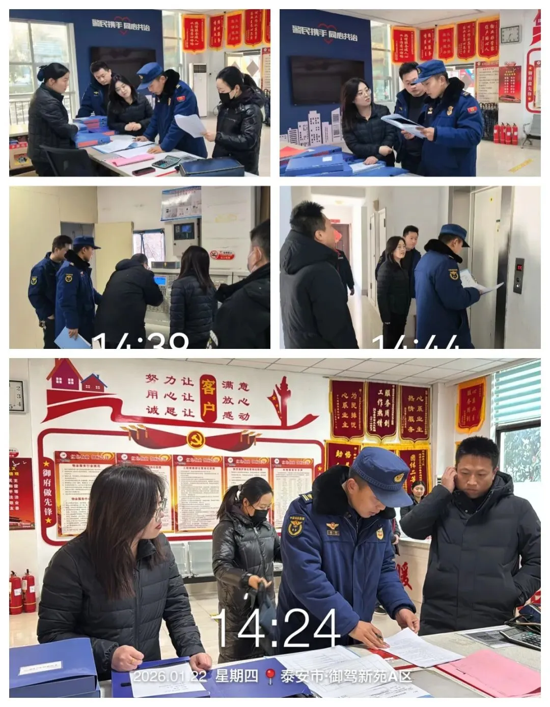 2026年1月22日泰山区消防大队工作人员莅临我物业开展消防安全检查,重点对消防管理文件、台账资料等进行细致核查,现场查阅相关记录并提出专业指导意见。物业将严格按照要求落实整改、完善资料,筑牢消防安全防线,切实保障园区安全与业主居住安全。