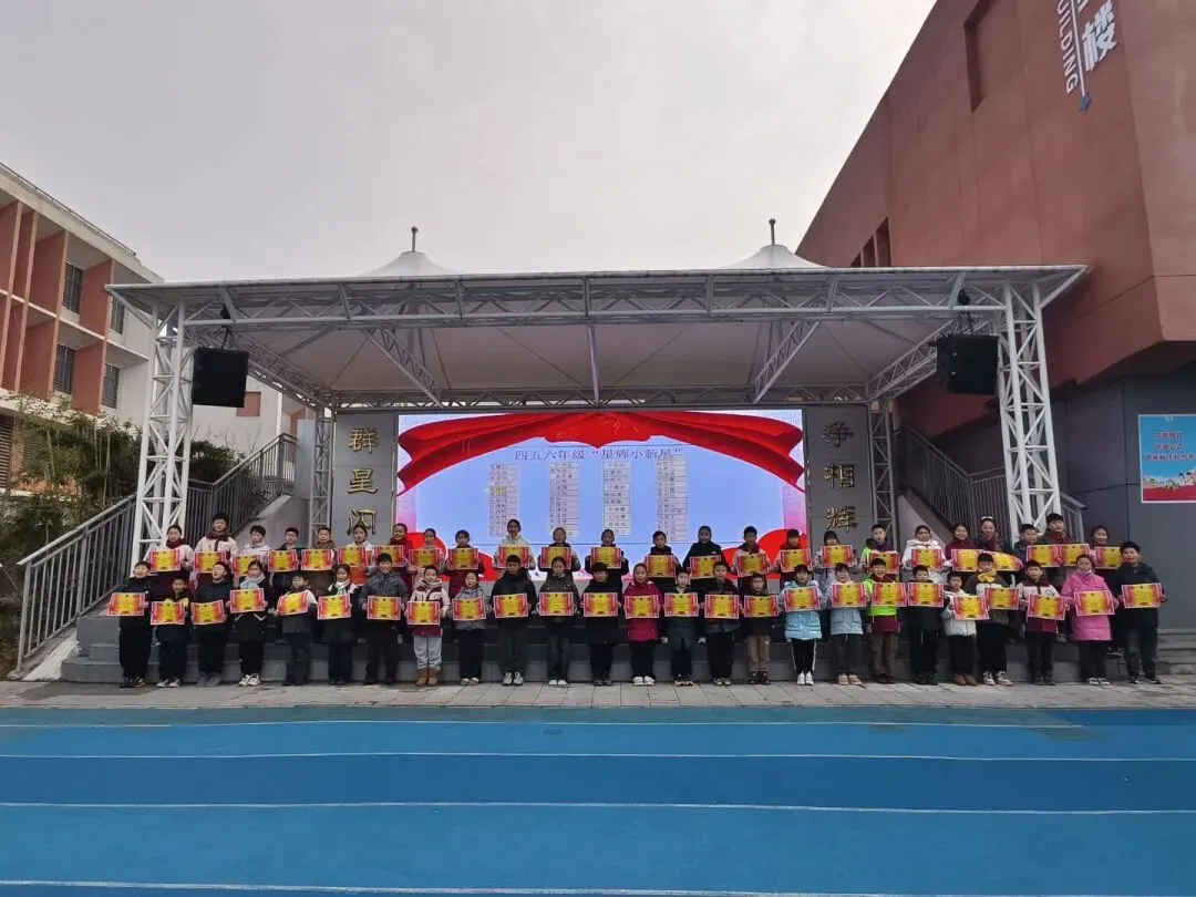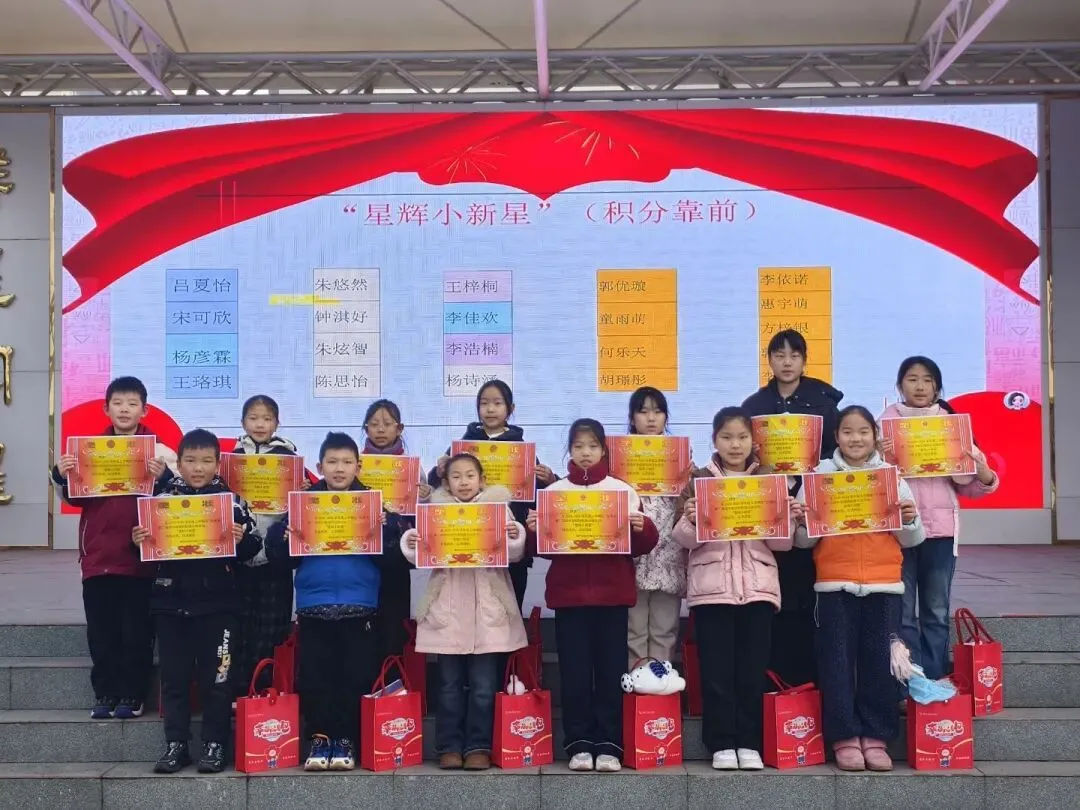 大课间的“五育积分颁奖仪式”,更是将当日的热烈氛围推向了顶点。当“星辉小新星”的名单在大屏幕上展示,积分靠前的孩子们依次走上舞台,接过沉甸甸的奖状与精美的礼品时,台下响起了此起彼伏的掌声与欢呼。他们手持奖状的模样,笑容灿烂又骄傲,这不仅是对他们一学期努力的肯定,更是童年时光里闪闪发光的珍贵记忆。