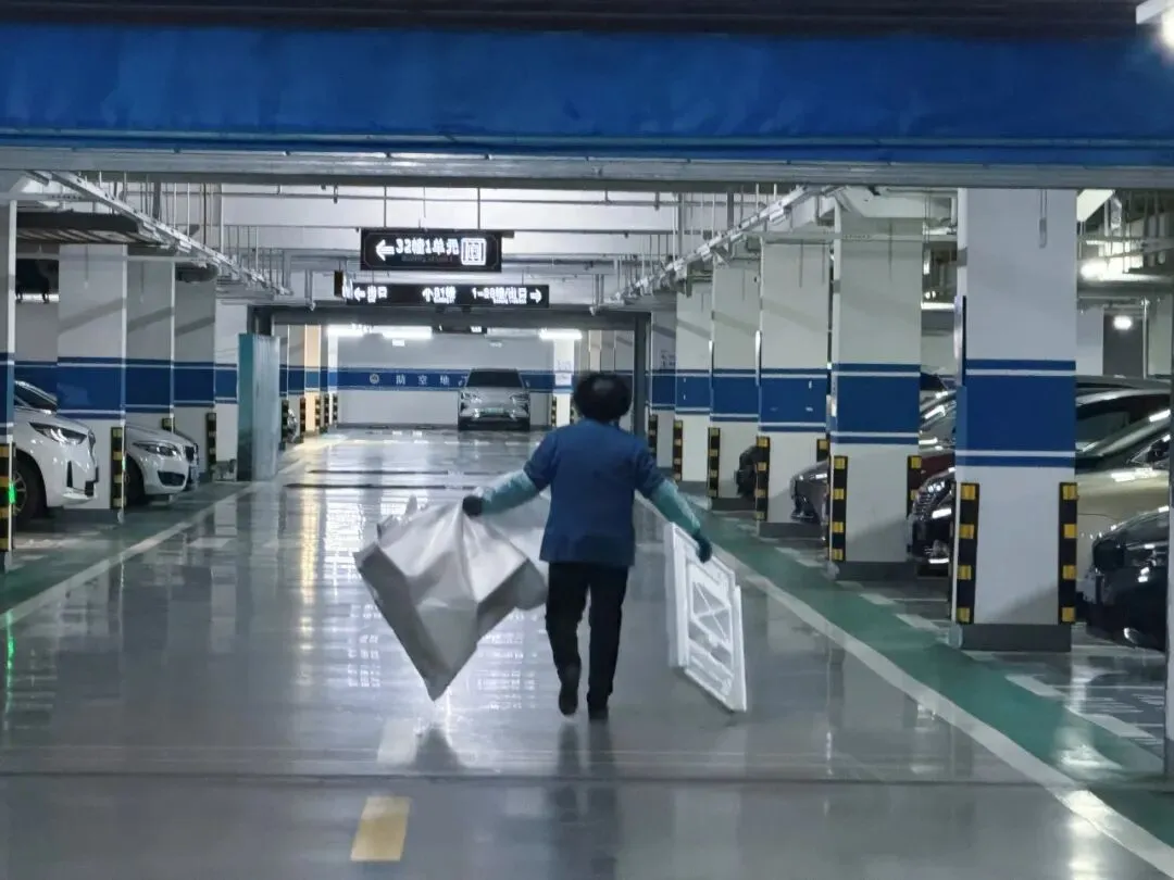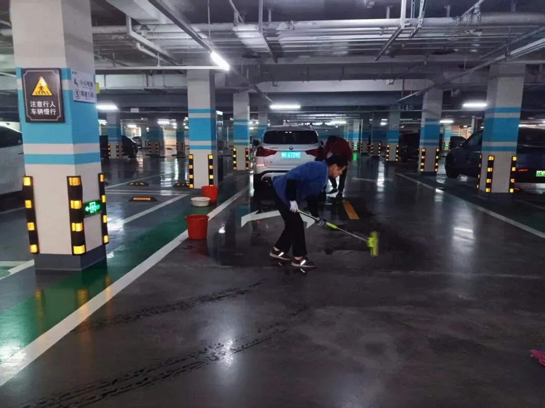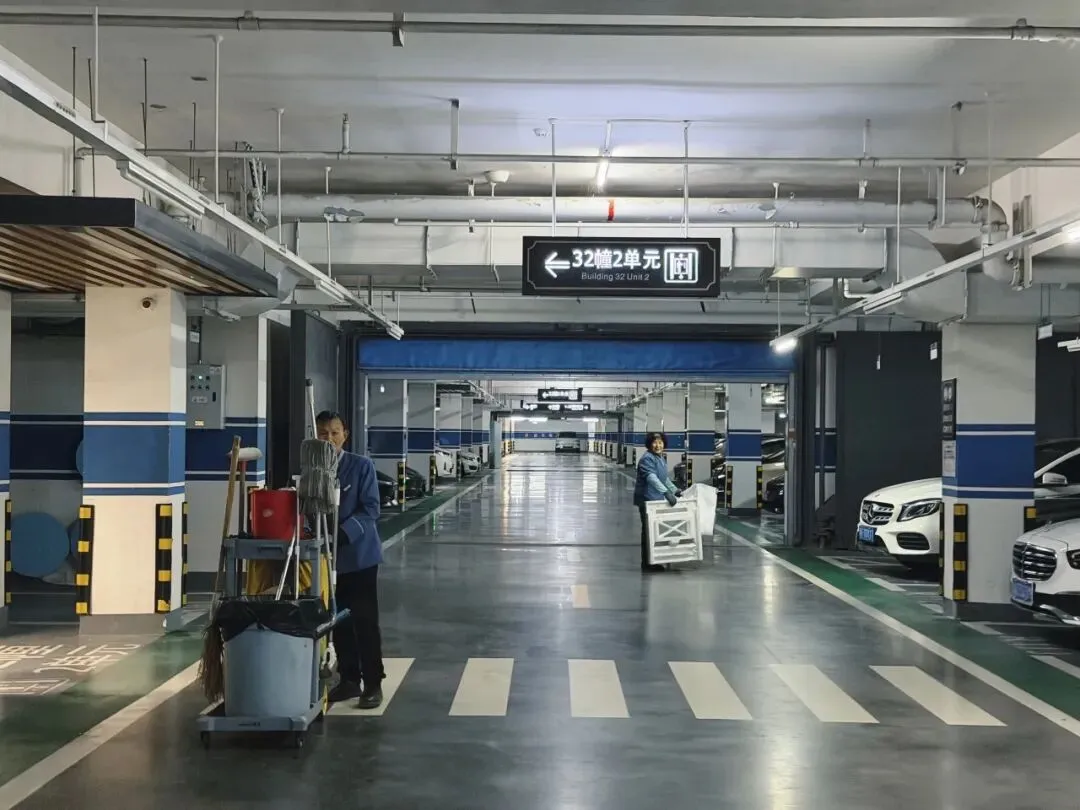 ⤵️车库洁净有守护!保洁大叔细致扫拖车库地面,阿姨认真清理各处垃圾,分工协作、默契配合,让地下车库常净常新✨