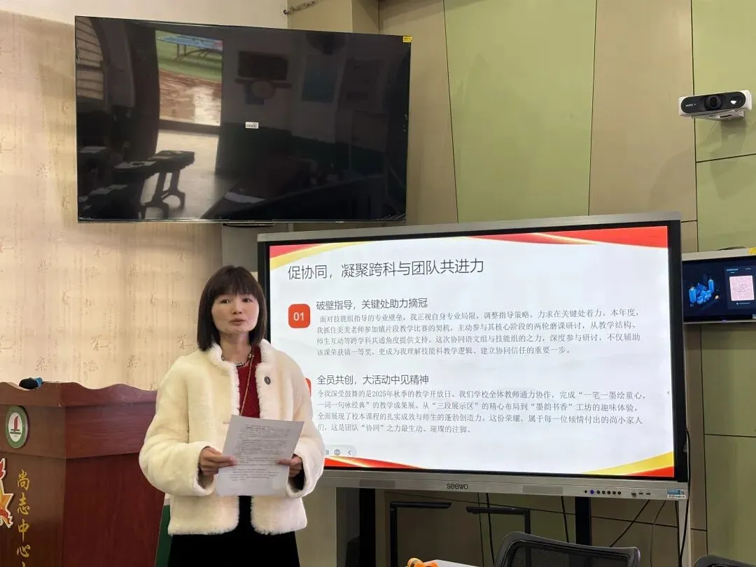 张金桂副教导以《以“务实”为笔 书“协同”之章》为题,分享了语文教研组“巧用信息技术,打造智慧课堂”的教研成果,以及将安全管理嵌入日常工作的实践经验。她提到,通过跨学科协同助力技能组教师参赛、牵头打造“一笔一墨绘童心”教学成果展等活动,切实凝聚了团队合力,并提出下学期将完善技能组定期共研机制、深化信息技术赋能课堂、探索“学科+安全教研”融合模式。
