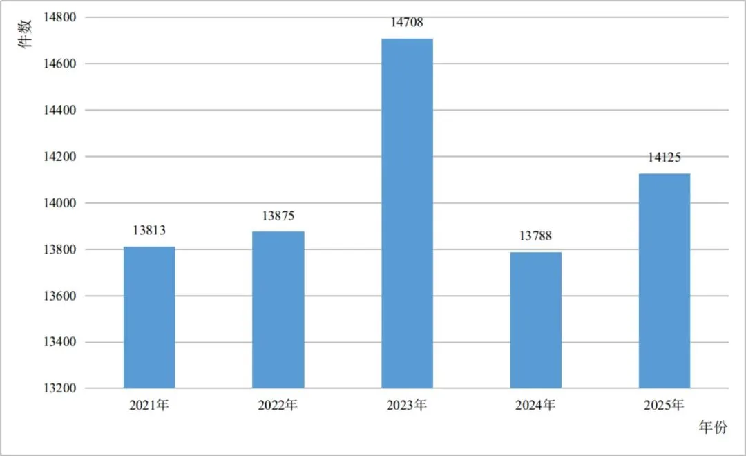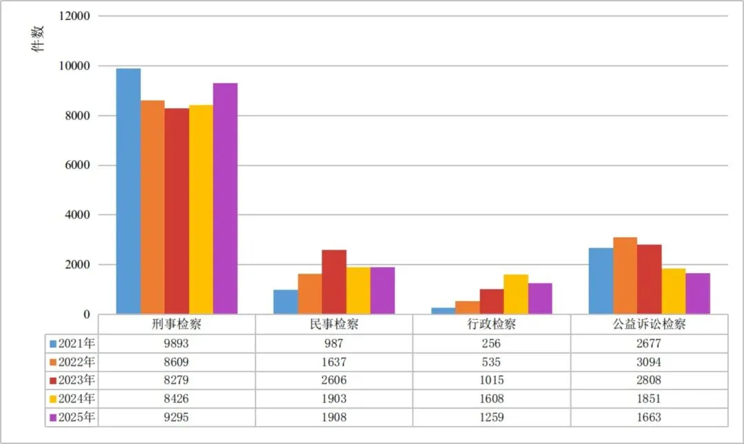 2021年—2025年全区检察机关“四大检察”业务趋势变化图。