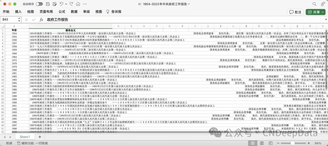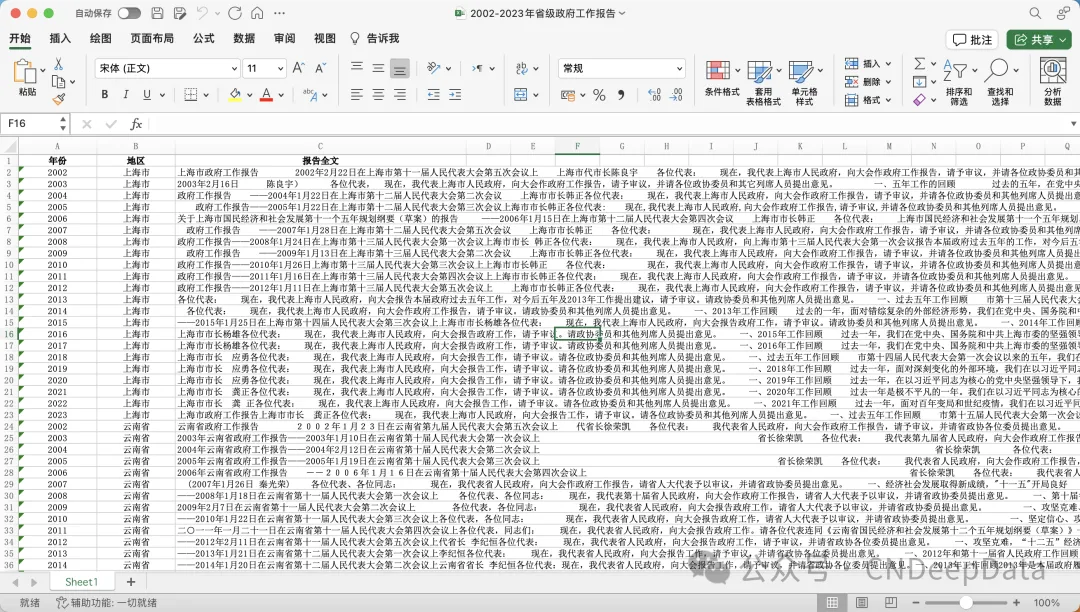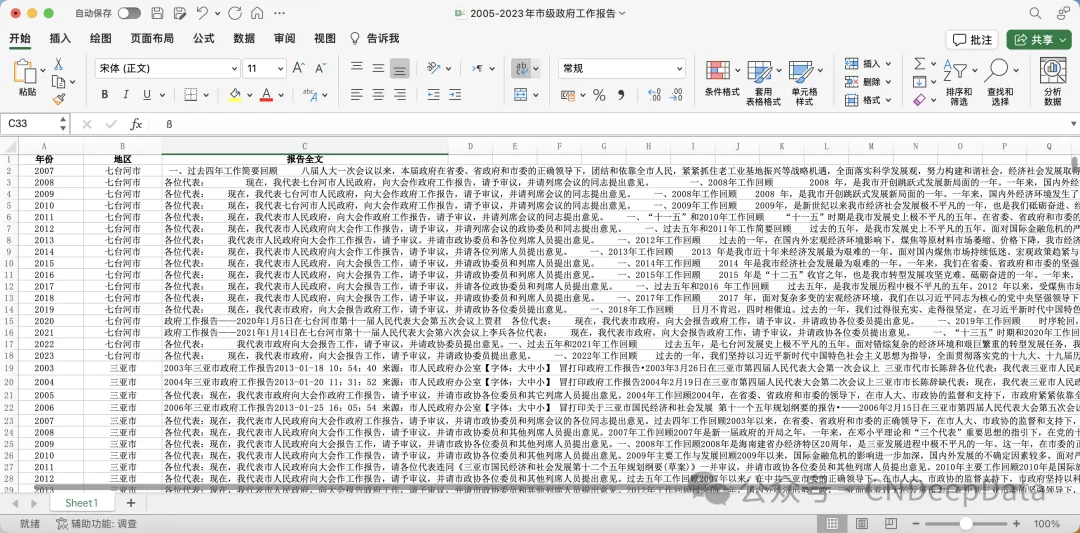 ▪ 数据说明:CNDD中央、省、市级政府工作报告数据包括中央、31个省(直辖市)、286个地级市历年的政府报告全文,数据通过excel打开。