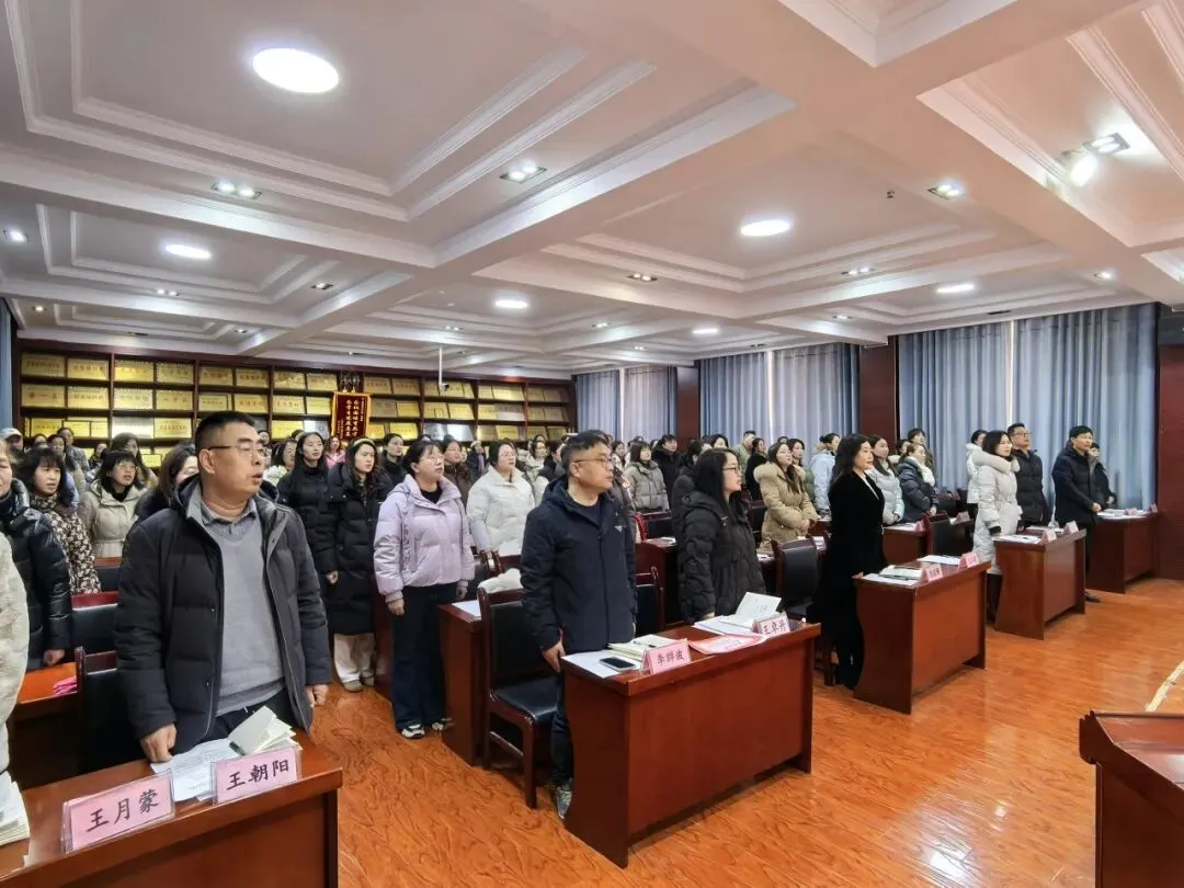 大会序幕,在庄严雄壮的国歌声中徐徐开启。全体教职工肃立致敬,齐声高唱,激昂的旋律与赤诚的歌声交汇,激荡起心中为党育人、为国育才的如磐初心与炽热情怀。