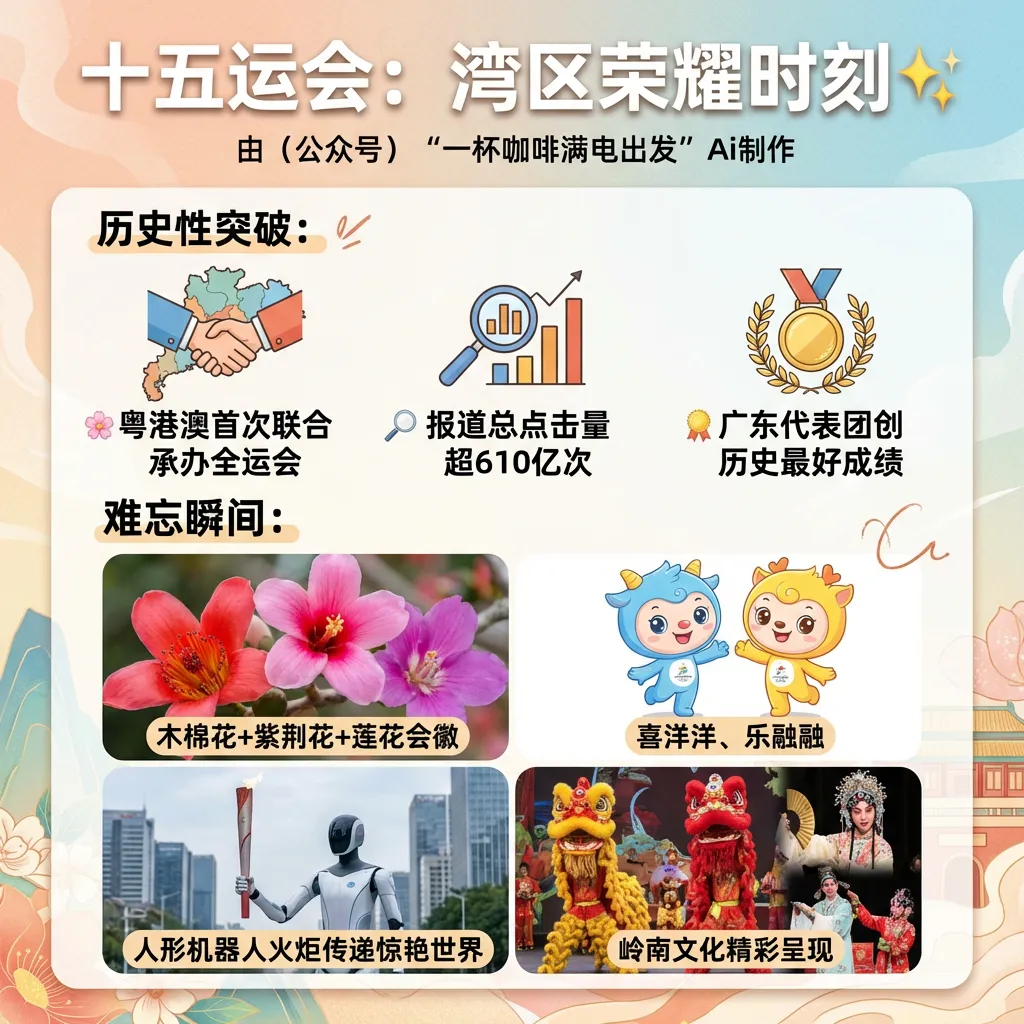 一是联合港澳承办十五运会和残特奥会。认真落实“绿色、共享、开放、廉洁”的办赛理念和“简约、安全、精彩”的办赛要求,向全国人民奉献了一场彰显制度优势、凝聚团结力量、展示湾区特色、体现岭南风格的体育盛会,相关报道总点击量超610亿次。那些激动人心的赛场瞬间,一个个不断创造的新纪录,广东木棉花、香港紫荆花、澳门莲花交叠而成的会徽,火爆出圈的吉祥物“喜洋洋”、“乐融融”,独特的源火采集和人形机器人火炬传递,以及珠江潮涌、鳌鱼游弋、南狮腾跃、粤韵悠扬对岭南文化的呈现,都令人印象深刻,展示了中国式现代化在粤港澳大湾区的万千气象和新时代中国人昂扬的精气神。广东代表团以使命在肩、奋斗有我的精神,敢打敢拼、超越自我,创造了历史最好成绩。在这里,我代表省人民政府,向所有为赛会成功举办付出辛苦努力、作出重要贡献的建设者、工作者、志愿者,向在赛场上顽强拼搏的运动员,致以崇高敬意!