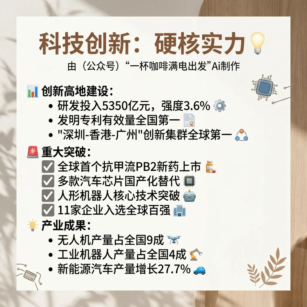 三是加快推进科技创新和产业创新深度融合。加快建设大湾区国际科技创新中心、综合性国家科学中心,预计全社会研发投入5350亿元、增长4.9%,研发投入强度达3.6%,发明专利有效量、高价值发明专利拥有量、PCT国际专利申请量、中国专利奖获奖数均居全国首位,“深圳—香港—广州”创新集群跃居全球首位。体系化布局建设多层次实验室,广州实验室成功研发上市全球首个抗甲流PB2新药,鹏城实验室先进通信技术研发取得突破,中国科学院东莞材料科学与技术研究所挂牌成立,江门中微子实验站、惠州强流重离子加速器建成运行,散裂中子源技术转化的新型重症治疗项目进入临床试验。昇腾384超节点集群、电子设计自动化软件、超高速实时示波器均取得重要进展,多款汽车芯片实现国产化替代。突破人形机器人热插拔自主换电、高动态运动控制等核心技术,11家企业入选全球人形机器人上市公司百强。低空经济产业链集聚更多关键企业,起降设施增至3592个,飞行规模达2061万架次。全国高校区域技术转移转化中心落户广东,建成国家人工智能学院深圳河套学院,创建3个国家人工智能应用中试基地,28个制造业中试平台入选全国首批重点培育名单。高交会促成1023项供需对接和投融资项目签约,成交额超1700亿元。推动1万家工业企业技术改造和数字化转型,东莞入选国家制造业新型技术改造城市试点,佛山、江门入选国家级中小企业数字化转型城市试点。全球灯塔工厂增至10家,国家卓越级智能工厂增至22家,创建首家国家领航级智能工厂。国家枢纽节点韶关数据中心集群建设扎实推进。加快大湾区高水平人才高地建设,9位科学家增选为两院院士,国家和省级重大人才工程入选人数创历史新高,“百万英才汇南粤”行动吸纳超110万名高校毕业生在粤就业创业。全省研发人员达159万人、高技能人才达843万人,均居全国首位。