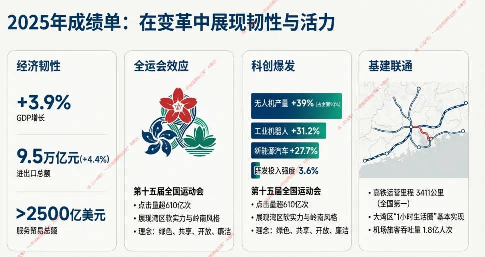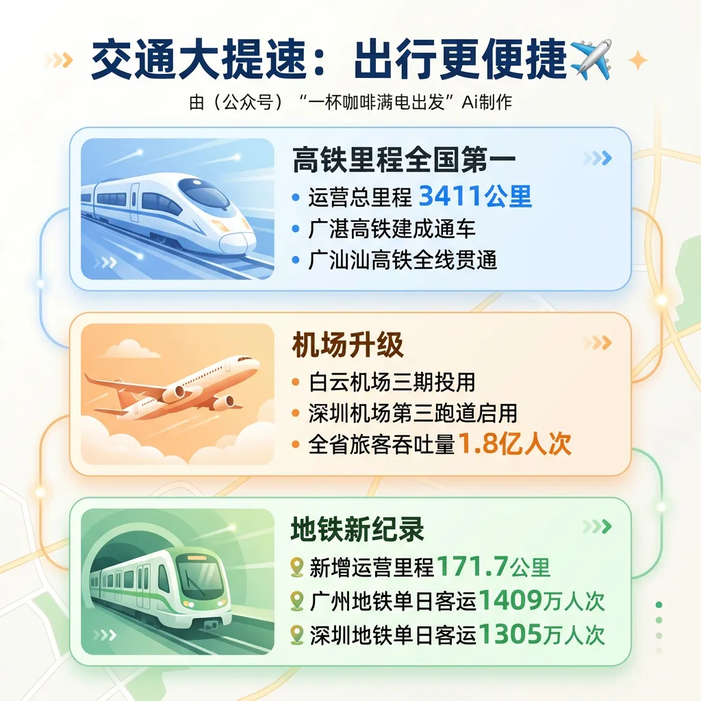 二是推动全省经济运行稳中有进、稳中向好。地区生产总值增长3.9%、总量连续37年居全国首位。地方一般公共预算收入增长3%。货物进出口总额9.5万亿元、增长4.4%,贡献了全国24.1%的增量。两届广交会吸引境外采购商人数再创新高,广东团现场成交额均超百亿美元。服务贸易总额突破2500亿美元、增长12.5%。实际使用外资1126.6亿元、增长11.3%,新设外资企业3.6万家、增长38.7%。农林牧渔业总产值增长4.9%。规模以上工业企业达7.6万家、增加值增长3%,巴斯夫核心装置、埃克森美孚一期、华润微电子12英寸产线、深汕比亚迪二期等一批重大项目建成投产,无人机产量增长39%、占全国9成,工业机器人产量增长31.2%、占全国4成,服务机器人产量增长11.2%、占全国8成,新能源汽车产量增长27.7%。银行机构本外币存贷款余额分别达38.7万亿元、29.9万亿元,招银金投、信银金投开业运营,组建总规模1000亿元的省战略性新兴产业投资引导基金,国家创业投资引导基金在大湾区设立超500亿元区域基金。开展“以旧换新”等促消费活动,社会消费品零售总额实现4.6万亿元、增长2.8%。办好“跟着全运游广东”系列活动,推出广东文旅地图、购物地图、美食地图、健身地图,预计全年接待游客9.6亿人次、增长10.3%,旅游总收入1.24万亿元、增长12.5%,口岸出入境人员达5.2亿人次、增长13.2%,其中外国游客增长34.9%,抵离口岸的交通工具达2813.8万辆(艘、架、列)次。努力扩大有效投资,新增专项债券和新型政策性金融工具规模居全国首位,获批超长期特别国债、中央预算内投资规模创历年之最。广湛高铁建成通车,广汕汕高铁全线贯通,高铁运营总里程3411公里、跃居全国第一。新增地铁运营里程171.7公里,广州、深圳地铁线网单日最高客运量分别达1409万、1305万人次,均创历史新高。建成阳信高速、增天高速等,高速公路通车总里程达1.2万公里。广州白云机场三期、深圳宝安机场第三跑道建成投用,揭阳潮汕机场成为全省第4个吞吐量超千万人次的机场,全省机场旅客吞吐量达1.8亿人次、增长8.8%。民航国际及地区通航点增至159个,国际集装箱班轮航线增至496条。港口集装箱吞吐量达8097万标箱、增长4.5%,机场货邮吞吐量达459万吨、增长5.6%,铁路货运量达10042万吨、增长4.2%,铁路旅客发送量达4.4亿人次、增长5.8%。