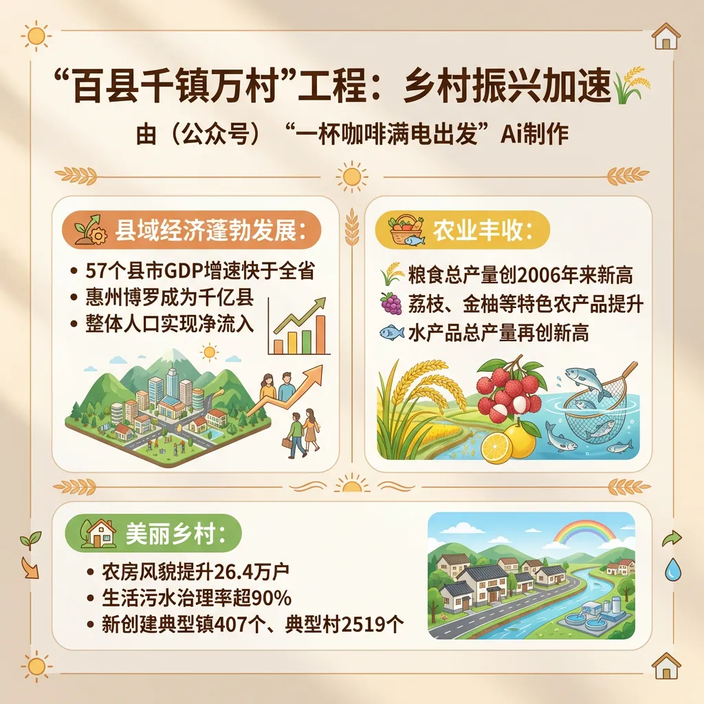 五是“百县千镇万村高质量发展工程”实现三年初见成效。优化调整省与市县共享收入分成比例,有效推动财力下沉。57个县(市)生产总值近3年年均增速快于全省,整体人口实现净流入。惠州博罗成为生产总值超千亿元县。信用评级AA级以上县(市、区)国企增至260家,茂名入选国家级深化普惠金融改革试点城市。全面开展“粤美县城”城市设计,新增22个新型城镇化建设试点、8个整县推进农文旅融合发展试点,新培育407个典型镇、2519个典型村和25个典型村片区。累计推动农房风貌提升26.4万户,行政村生活污水治理率提高到90%以上。粮食总产量创2006年以来新高,单产创历史新高,在国家耕地保护和粮食安全责任制考核中获优秀等次。荔枝、金柚等特色农产品产量持续提升,以“媒体+”助力农产品品牌升级、销量攀升,新创建云浮罗定、茂名化橘红国家地理标志保护示范区。在丝苗米、肉鸡等方面育成一批突破性新品种,全省农业科技进步贡献率超74%。启动建设7个省级渔港经济区,新建重力式深水网箱2000个,水产品总产量再创新高。