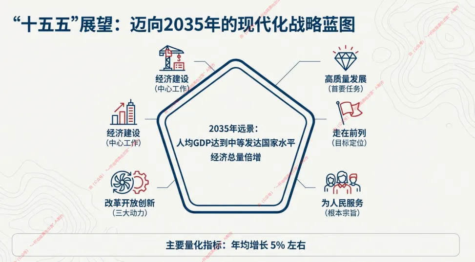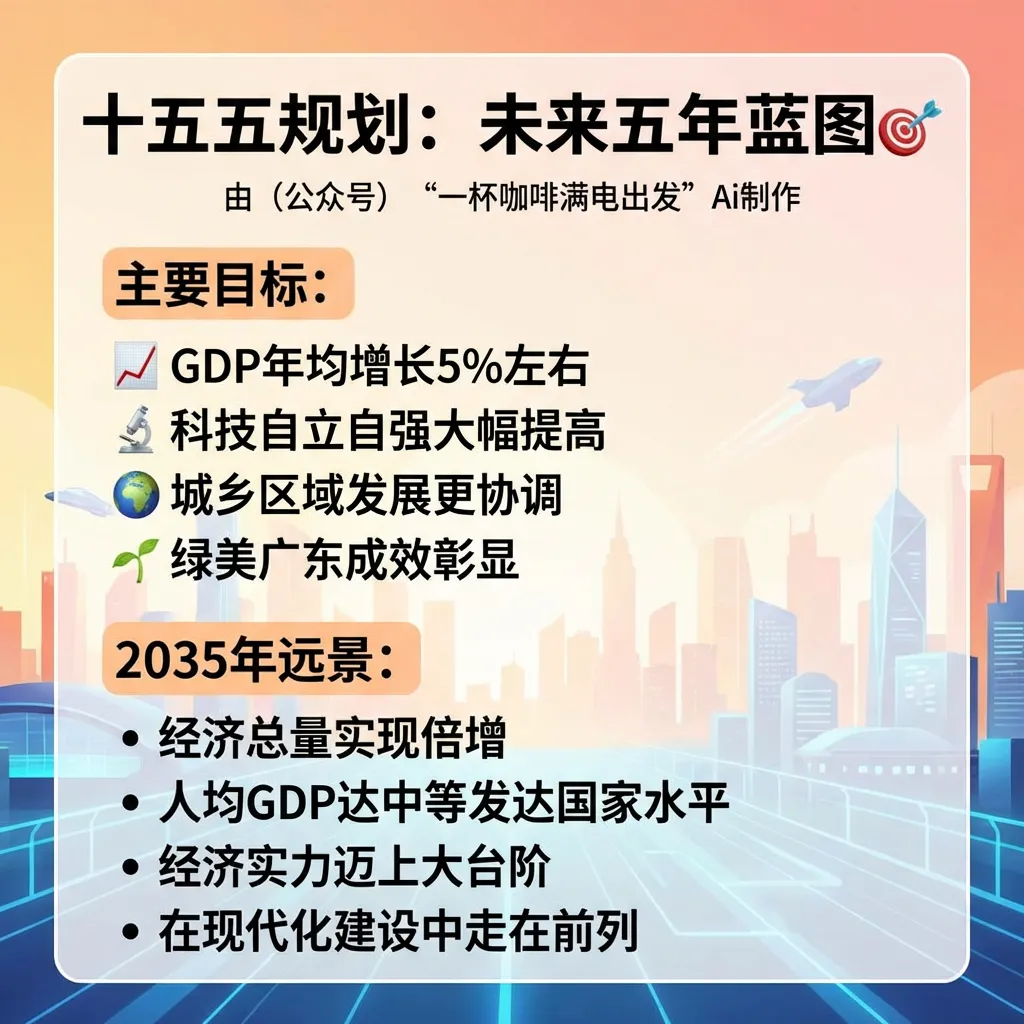 “十五五”时期经济社会发展的主要目标是:地区生产总值年均增长5%左右,高质量发展取得显著成效,科技自立自强水平大幅提高,城乡区域发展更加协调,进一步全面深化改革取得新突破,社会文明程度明显提升,人民生活品质不断提高,绿美广东生态建设成效彰显,发展的安全基础更加坚实。展望未来,从党的二十大到二〇三五年,用13年时间基本实现社会主义现代化,经济总量实现倍增,人均地区生产总值达到中等发达国家水平,人民生活更加殷实、更加幸福美好,经济实力、科技实力、综合实力迈上大台阶,以昂扬姿态在推进中国式现代化建设中走在前列。政府工作中,我们要重点把握好5个方面: