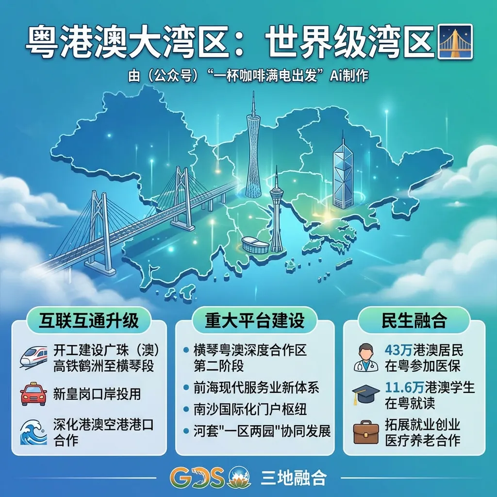 打造高质量发展动力源。深化广州、深圳双城联动、战略协同,支持广州实现老城市新活力和“四个出新出彩”、加快重构产业发展新优势,支持深圳建设好新时代经济特区、建设好新征程中国特色社会主义先行示范区。支持珠海、佛山、惠州、东莞、中山、江门、肇庆等重要节点城市提升发展能级。携手港澳健全协商合作机制,持续深化规则衔接、机制对接和政策协同、资源共享。加强科技创新合作,积极对接港澳高端科创资源,推进重大科技基础设施等战略科技力量共建共享,协同开展技术研发、中试转化、场景拓展。推进基础设施互联互通,深化轨道交通“四网融合”,开工建设广珠(澳)高铁鹤洲至横琴段,建成投用新皇岗口岸,用好管好港珠澳大桥,深化与港澳空港联动、港口合作,加快建设世界级机场群、港口群。有效提升市场一体化水平,拓展湾区标准、湾区认证实施领域,深入实施职业资格认可,加快推动粤港澳游艇自由行,联动港澳探索开展低空跨境合作,加强立法、执法、司法各环节全流程协作,推动要素跨境高效便捷流动。建设宜居宜业宜游优质生活圈,拓展教育、就业、创业、医疗、养老、体育等领域合作,推进生态环境共保联治。
