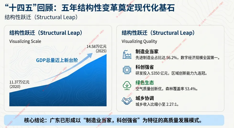 这是经济实力持续提升的五年。地区生产总值从11.37万亿元提高到14.58万亿元,人均地区生产总值从9万元提高到11万元。三次产业比重为4.0∶37.7∶58.3,第一产业增加值提升至全国第二,先进制造业、高技术制造业增加值占规模以上工业增加值比重分别达56.2%、34.7%,现代服务业增加值占服务业增加值比重达64.9%,数字经济规模稳居全国首位。地方一般公共预算收入从1.29万亿元提高到1.39万亿元。进出口总额接连突破8万亿元、9万亿元,年实际使用外资保持在千亿元以上。