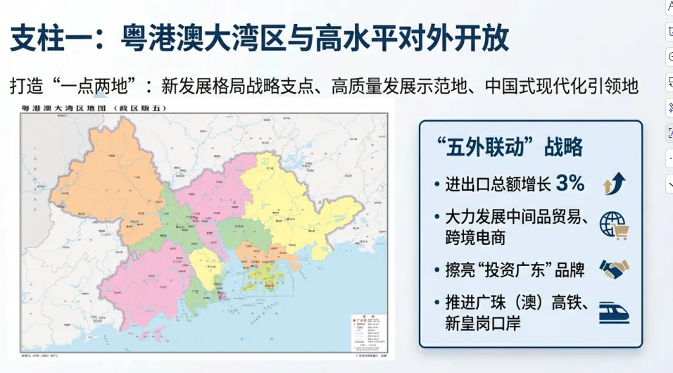 优化对外开放格局。深度融入共建“一带一路”,积极对接西部陆海新通道,加快中欧班列广州集结中心、深圳节点城市建设,拓展国际海运航线网络,加快汕头、湛江临港经济区建设。健全海外综合服务体系,推动境外经贸合作区拓展功能,引导产业链供应链合理有序跨境布局,培育更多源自广东、总部在广东的跨国公司。促进各市高标准建设国际一流的出入境、住宿、饮食、交通、游览、消费、医疗等全场景全链条服务体系,完善多语种标识、便捷化支付等服务,营造宾至如归的国际化环境。服务好保障好亚太经合组织(APEC)第三十三次领导人非正式会议,吸引集聚更多国际高端要素,积极促进全省有更多开放成果和合作成果。