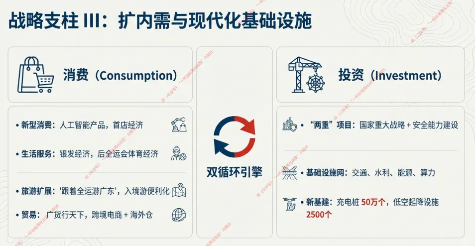 推动货物贸易持续稳定发展。积极寻找所有可能的市场和增长机会,全力巩固欧美日韩等传统市场,加大力度开拓东盟、中东、非洲、中亚等新兴市场,加快建立面向中长期的进出口贸易对冲平衡机制,全年进出口总额增长3%左右。办好用好广交会、高交会、中国航展、中博会和粤贸全球系列境外展,提升贸易促进平台功能,积极对接世界知名贸易商。巩固一般贸易主体地位,推动加工贸易从制造组装向产业链两端延伸,大力拓展中间品贸易,促进绿色贸易发展。推动跨境电商加海外仓模式扩容升级,促进跨境电商高端化、品牌化、智能化发展,培育壮大市场采购、保税维修等新业态。扩大高技术产品、设备和能源资源进口,做大面向全国市场的高品质消费品进口业务。推进现代化智慧口岸和“单一窗口”优化建设,推动综合保税区高质量发展。办好粤贸全国系列活动,支持外贸企业与商贸平台、电商平台合作,打通出口转内销渠道,促进内外贸一体化发展。