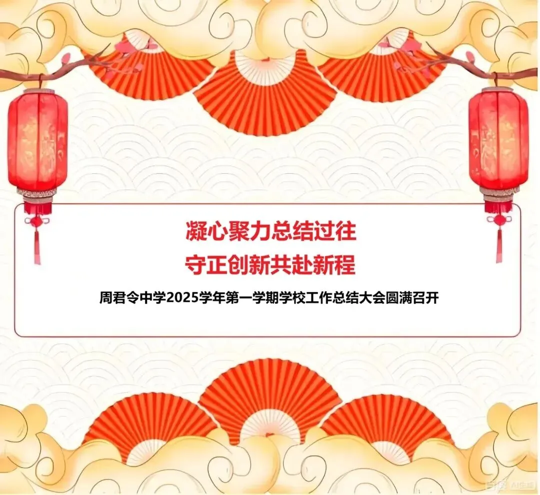 本次总结大会既是对一学期工作的全面复盘,更是对新征程的有力动员。站在新的起点上,周君令中学全体教职工将以更饱满的热情、更务实的作风,深耕教育沃土,培育时代新人,共同书写学校发展的崭新篇章。