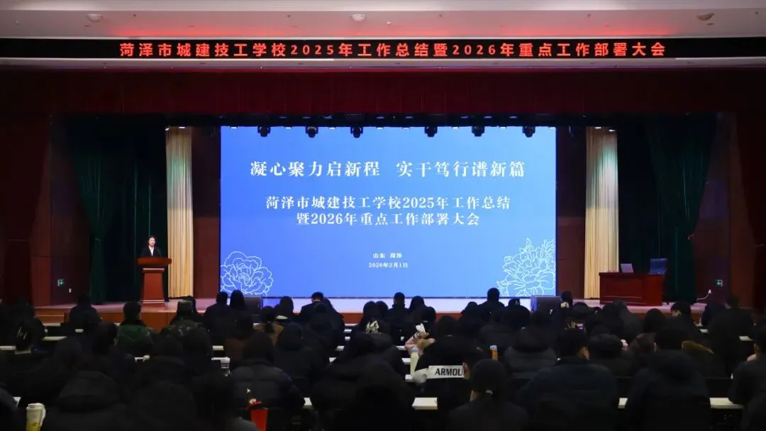 为全面总结2025年度办学成效,科学谋划2026年发展蓝图,进一步凝聚全校共识、细化工作举措、压实全员责任担当,2月1日,菏泽市城建技工学校召开2025年工作总结暨2026年重点工作部署大会。菏泽城建教育发展有限公司及菏泽市城建技工学校领导班子成员、全体教职工参会。