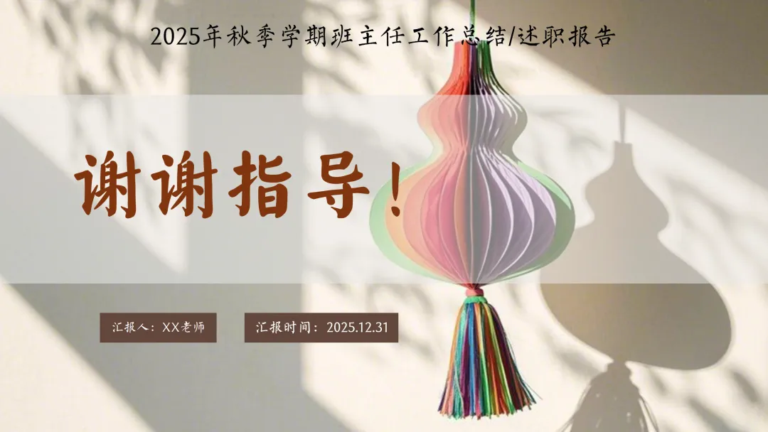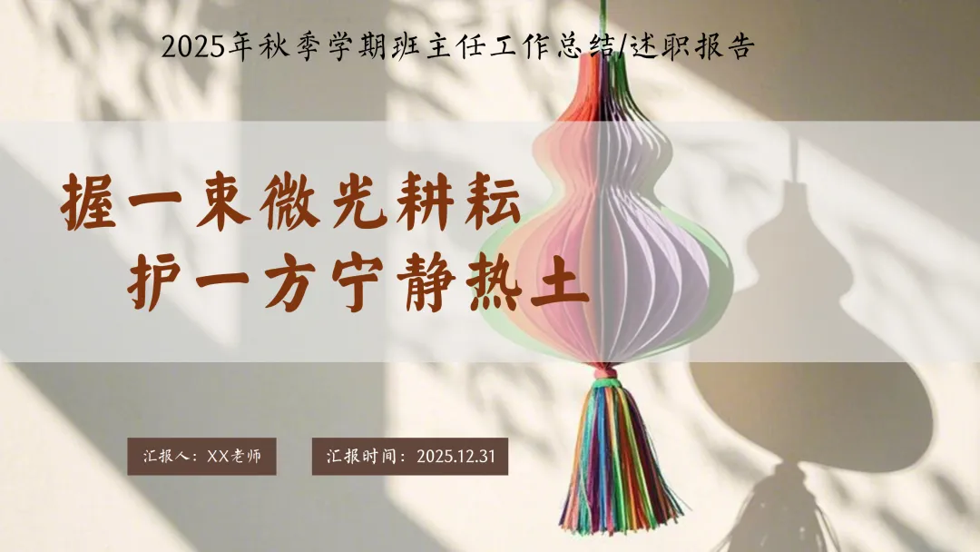 很高兴在这与您相遇,如果您是一位班主任老师,每天除了应对繁重的教学工作,还要加班整理班级、教务、教研、课件PPT资料,请关注下方的“小木教务资料”,让我们风雨同路、一起成长~今天分享的是2025-2026学年第一学期班主任工作总结的ppt课件和配套的发言稿,主题是《握一束微光耕耘,护一方宁静热土》2025-2026学年第一学期
