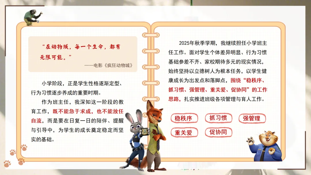 正如电影《疯狂动物城》中所说:“在动物城,每一个生命,都有无限可能。”小学阶段,正是学生性格逐渐定型、行为习惯逐步养成的重要时期。作为班主任,我深知这一阶段的教育工作,既不能急于求成,也不能放任自流,而是要在日复一日的陪伴、提醒与引导中,为学生的成长奠定稳定而坚实的基础。