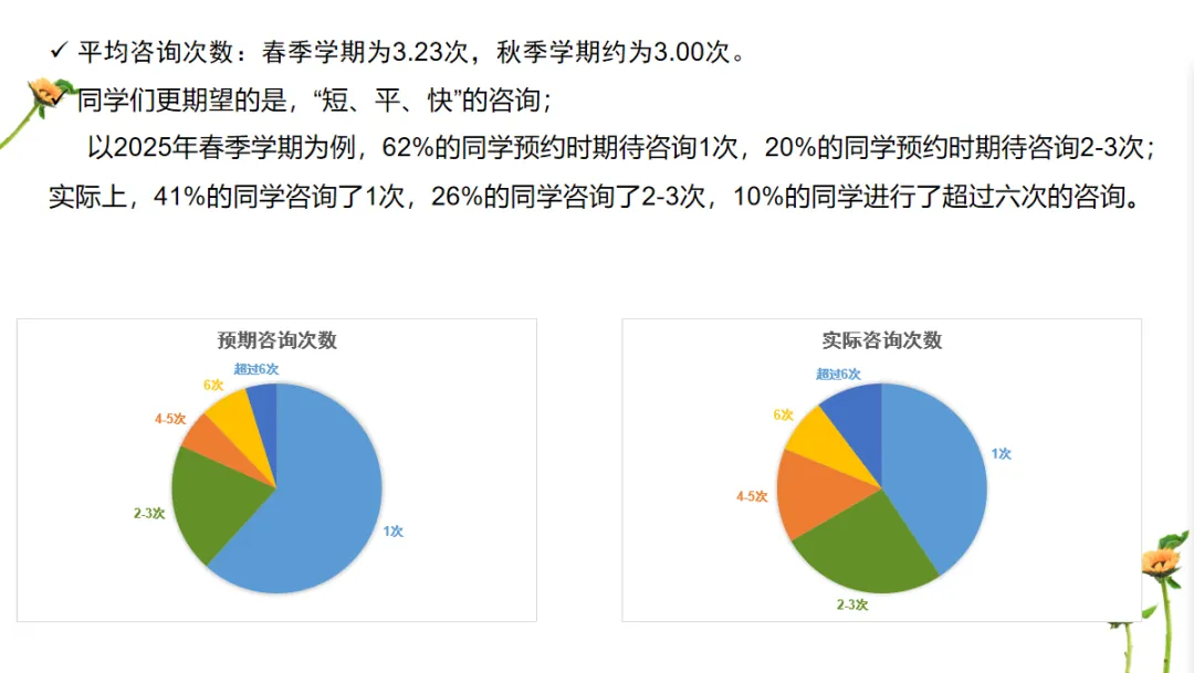 本年度学生咨询仍呈现“短、平、快”的偏好,学生预约时期待的咨询次数较实际咨询次数更少。中心实际咨询次数春季学期为3.23次,秋季学期约为3.00次,显著高于同类高校,中心为10%的同学提供了更持续的服务,也反映了学校一贯的人文关怀。