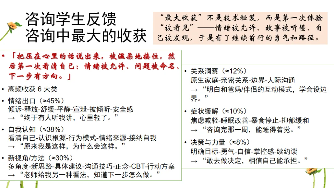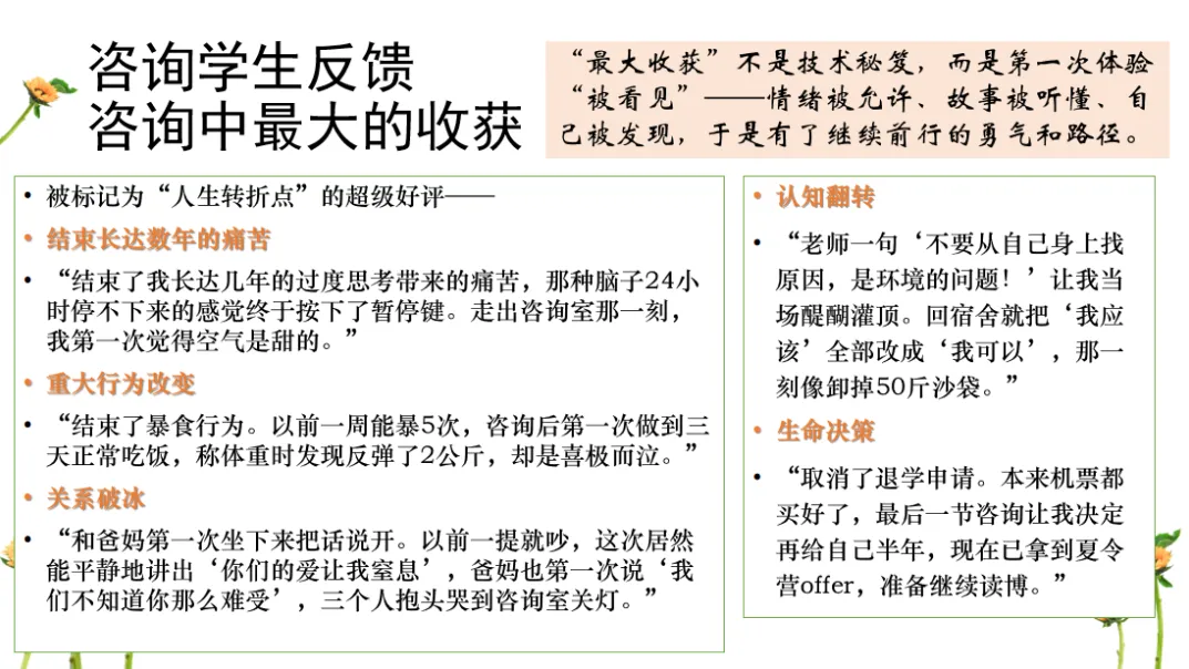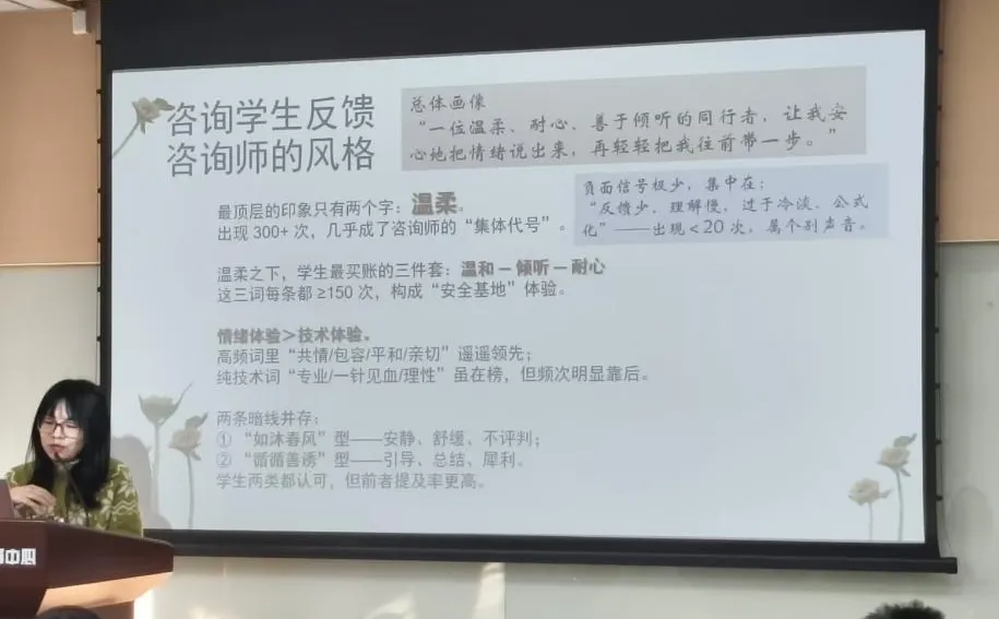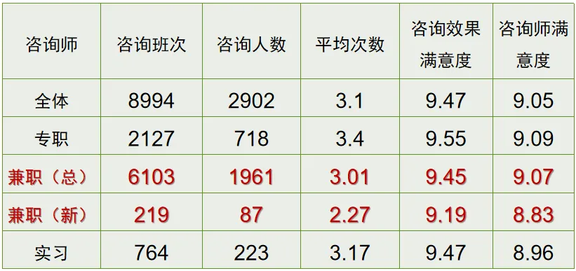 回顾2025,中心依托4个咨询点,由13位专职咨询师、46位兼职咨询师及9位实习咨询师共同构建了专业的服务网络。全年咨询排班最大容量达每周111班,实际服务学生2400人,完成咨询8600人次,再创历史新高。咨询响应速度上看,95%的咨询预约在2天内被响应、安排,99%的咨询预约在一周内被响应安排,在全国遥遥领先。