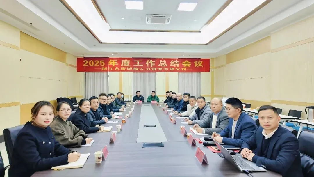 2月1日,浙江永康诚捷人力资源有限公司2025年度工作总结会议在浙江永康五金产业人力资源服务产业园举行,公司董事长兼总经理袁昌盛、副总经理刘鹏飞、财务总监陈癸蓉、行政部经理潘国富、永康公司、杭州分公司等30余名管理人员代表现场参加了本次总结会,由于年底部分因工作原因没有到现场的管理人员以视频会议方式参加了总结会。会议由公司副总经理刘鹏飞主持。