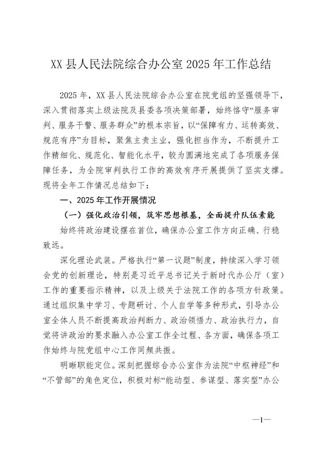 >XX县人民法院综合办公室2025年工作总结(3899字)