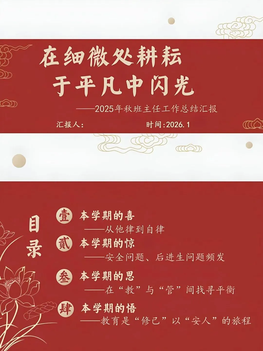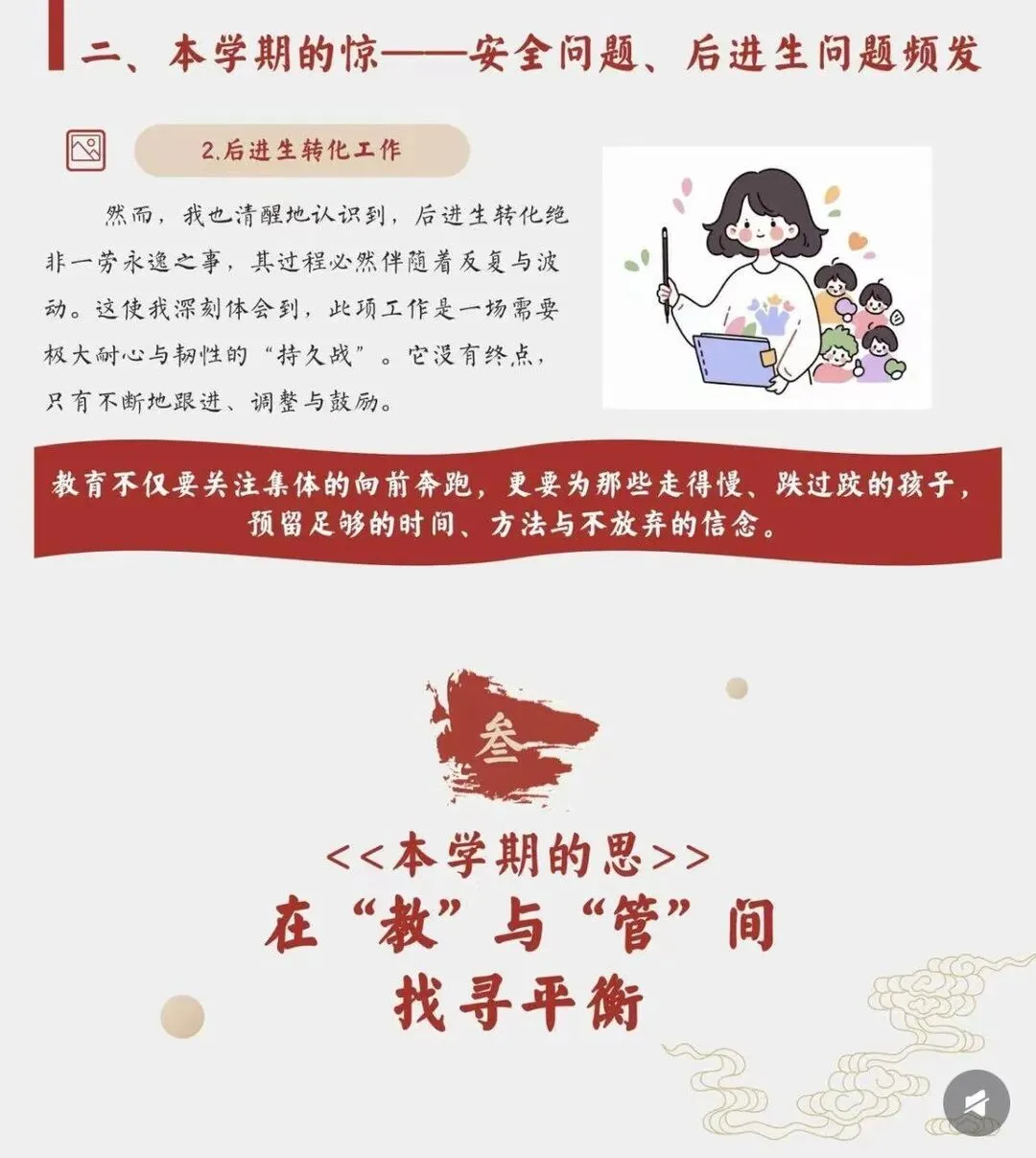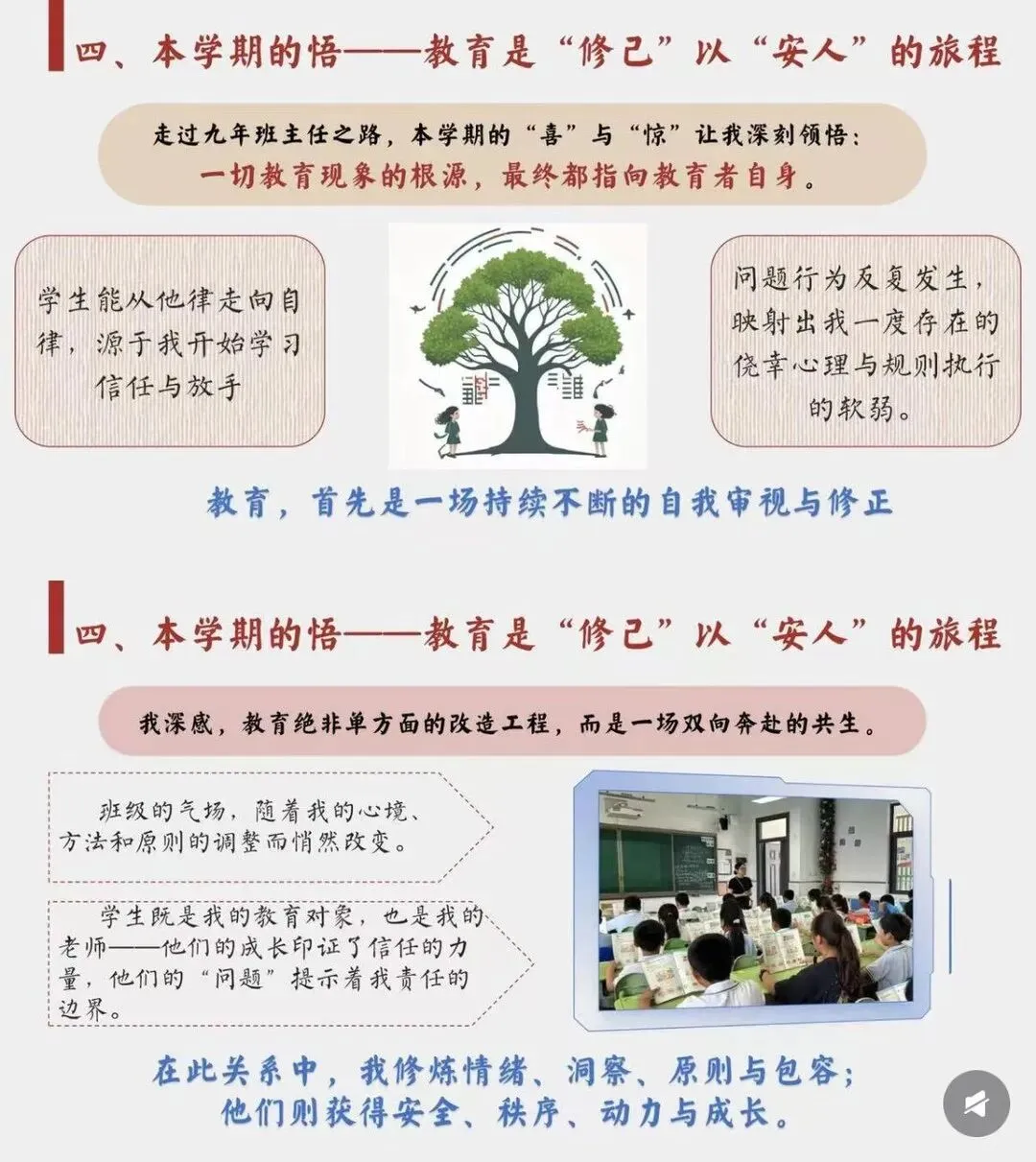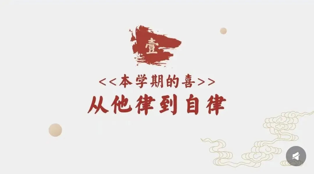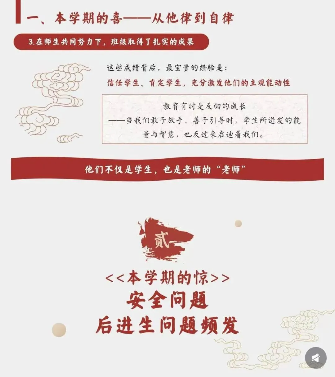 [一R]本学期的喜 —从他律到自律 [二R]本学期的惊 ——安全问题、后进生问题频发 [三R]本学期的思 —在“教”与“管”间找寻平衡 [四R]本学期的悟 -教育是“修已”以“安人”的旅程