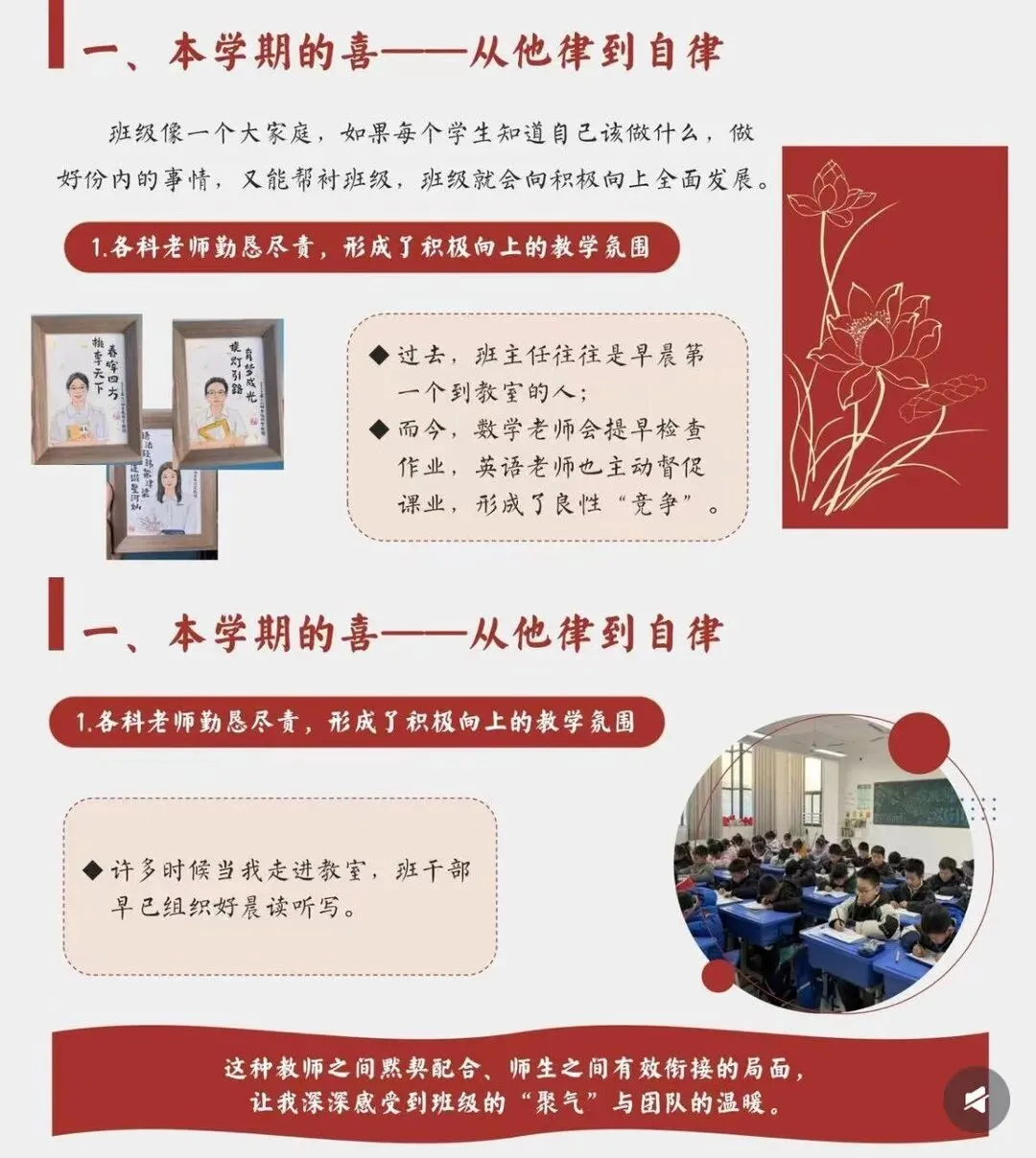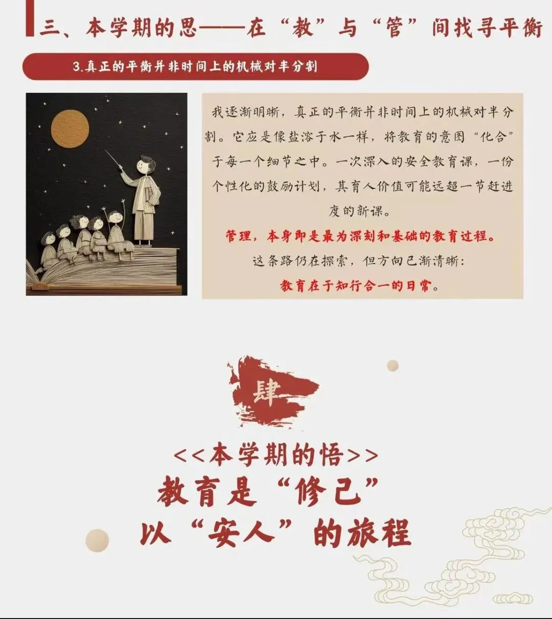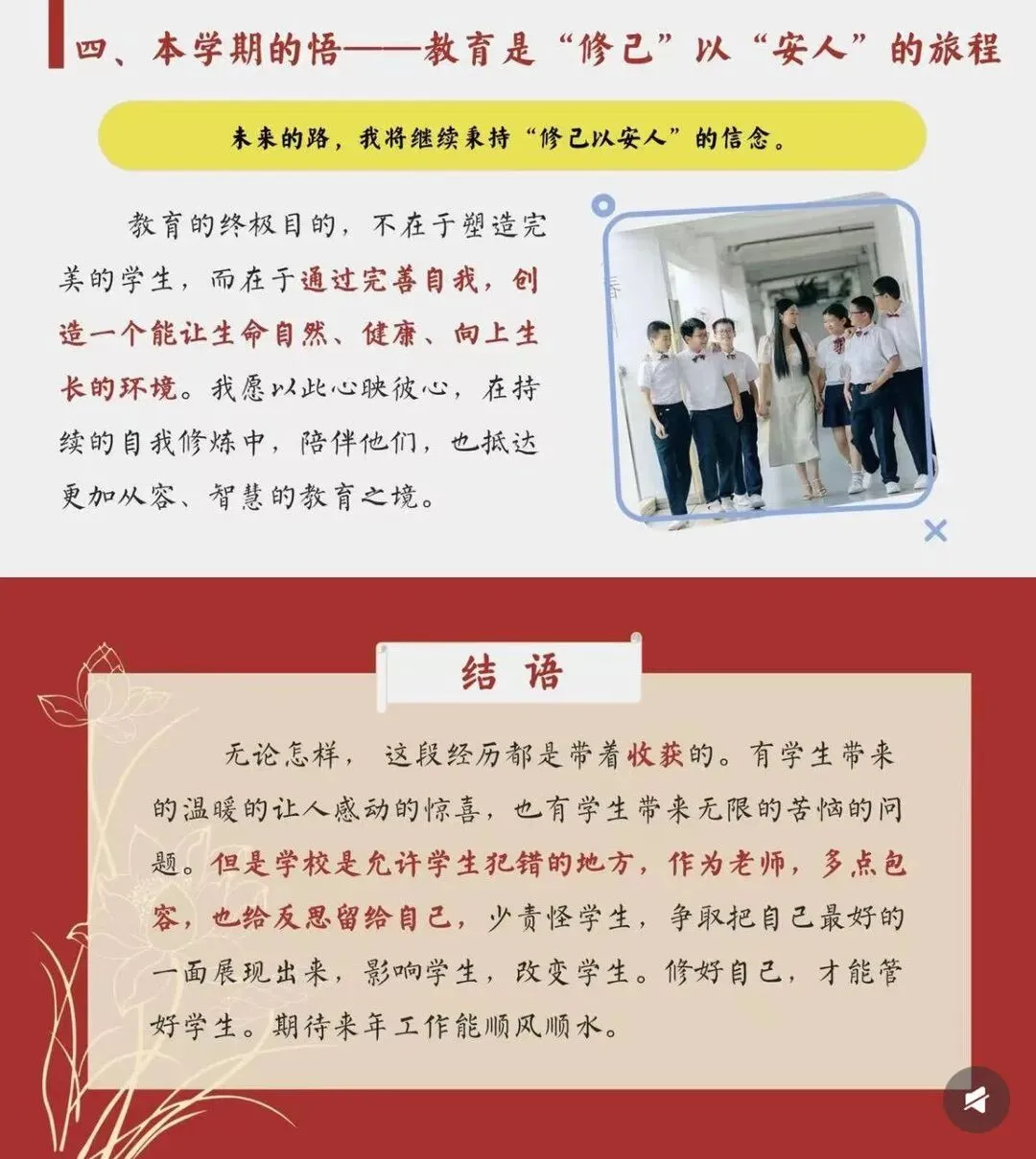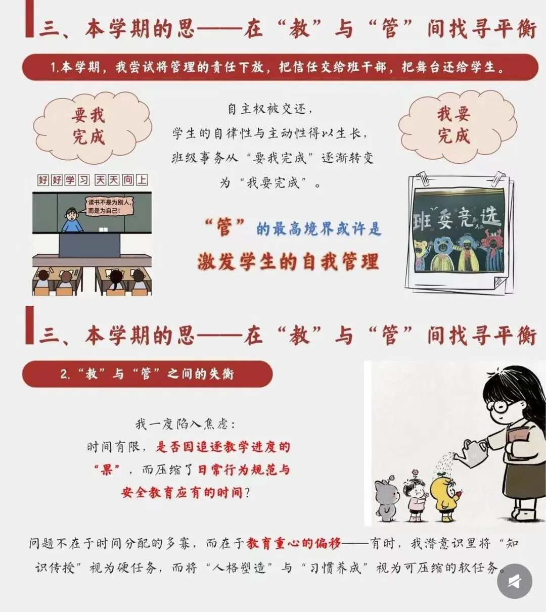 [一R]本学期的喜 —从他律到自律 [二R]本学期的惊 ——安全问题、后进生问题频发 [三R]本学期的思 —在“教”与“管”间找寻平衡 [四R]本学期的悟 -教育是“修已”以“安人”的旅程