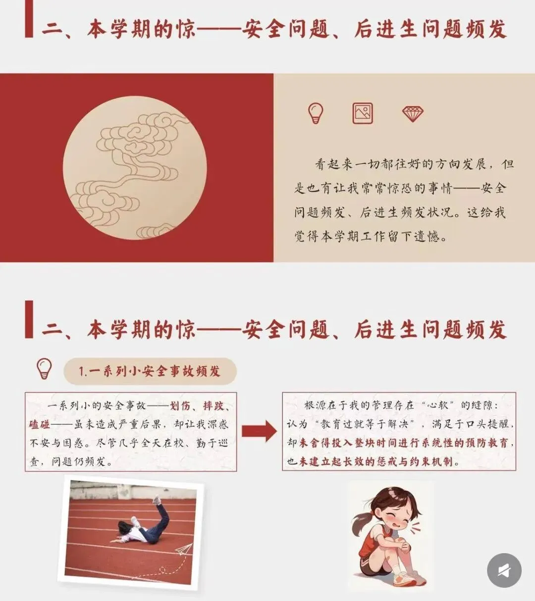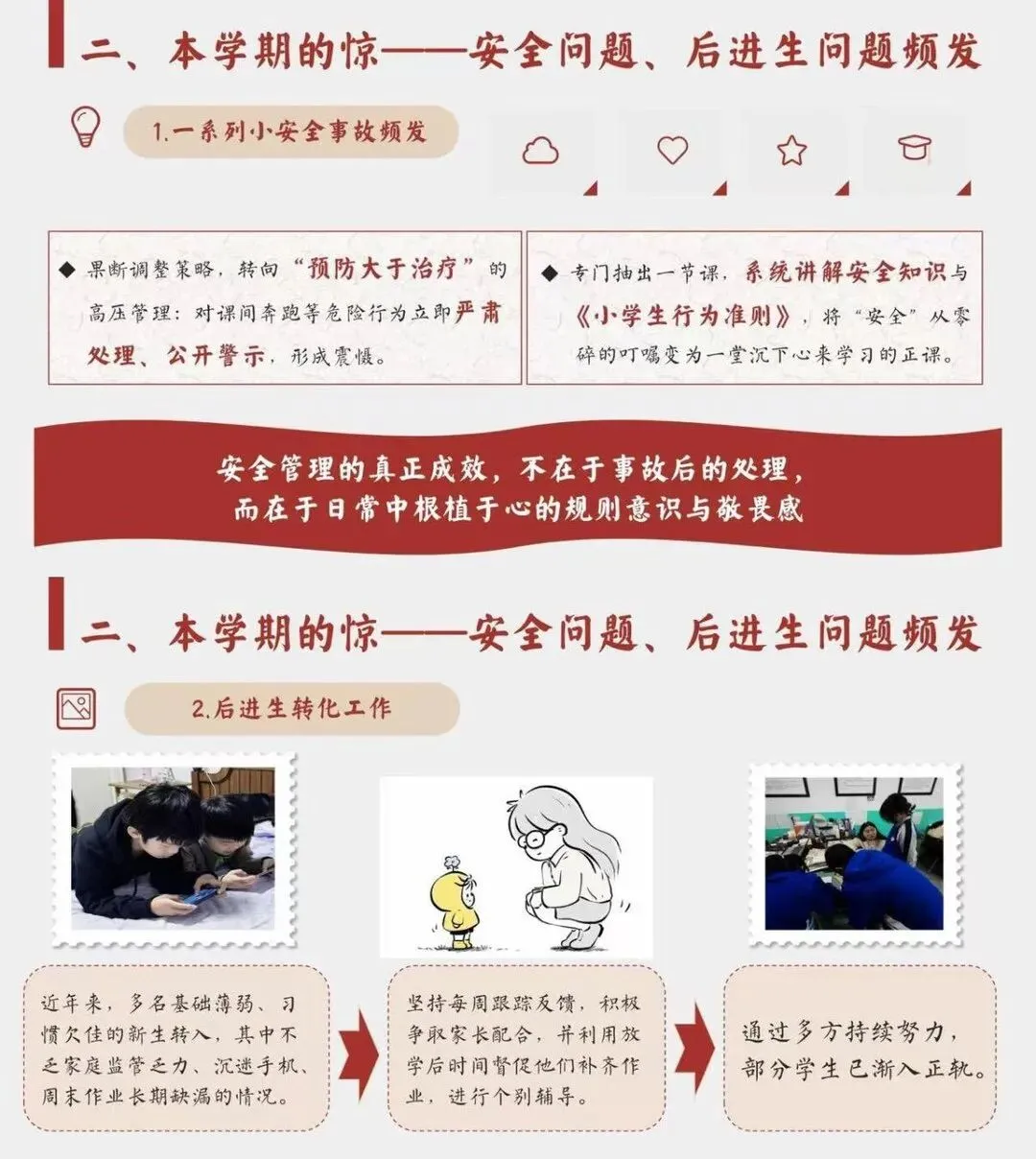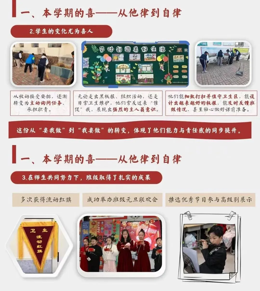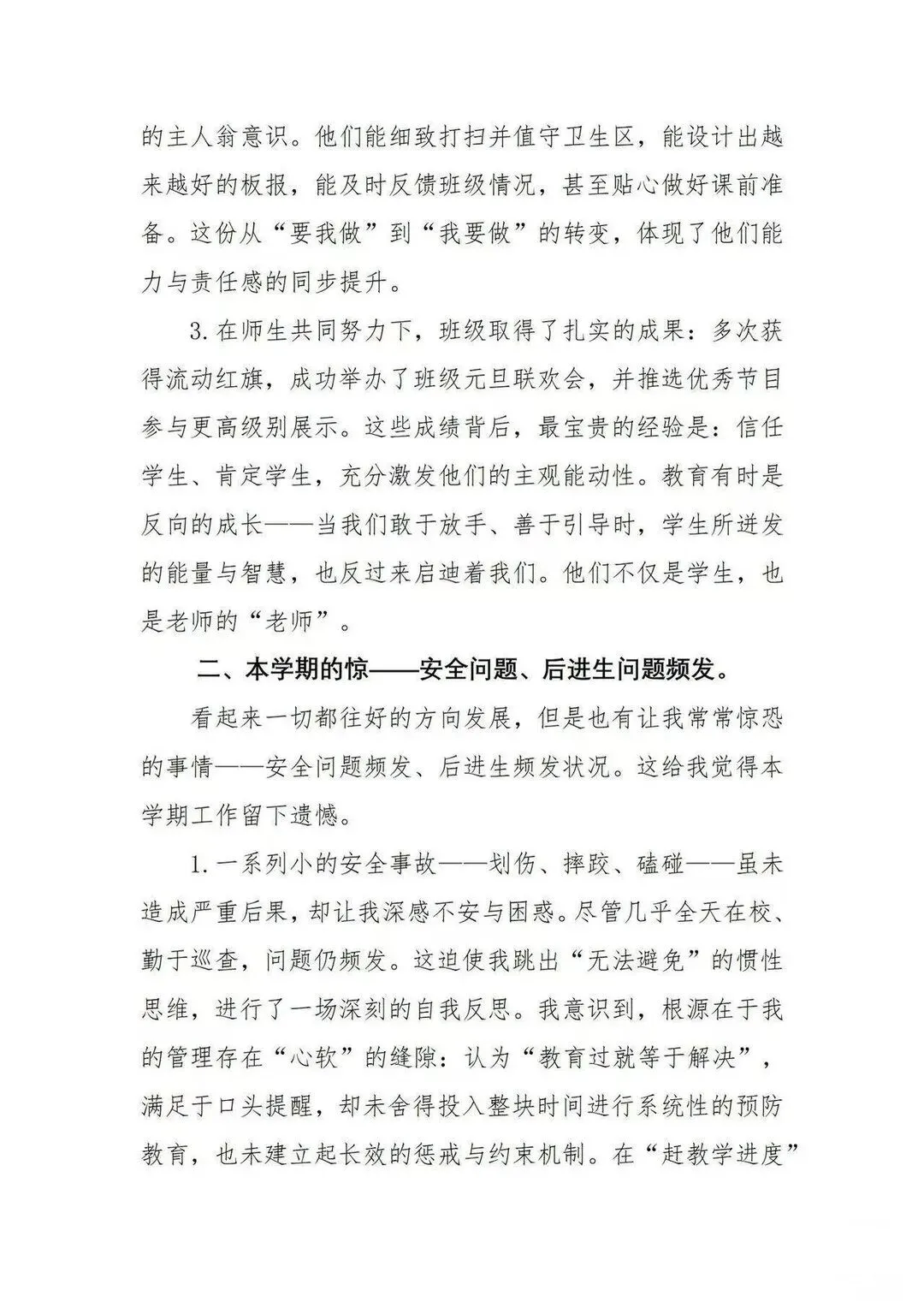 [一R]本学期的喜 —从他律到自律 [二R]本学期的惊 ——安全问题、后进生问题频发 [三R]本学期的思 —在“教”与“管”间找寻平衡 [四R]本学期的悟 -教育是“修已”以“安人”的旅程