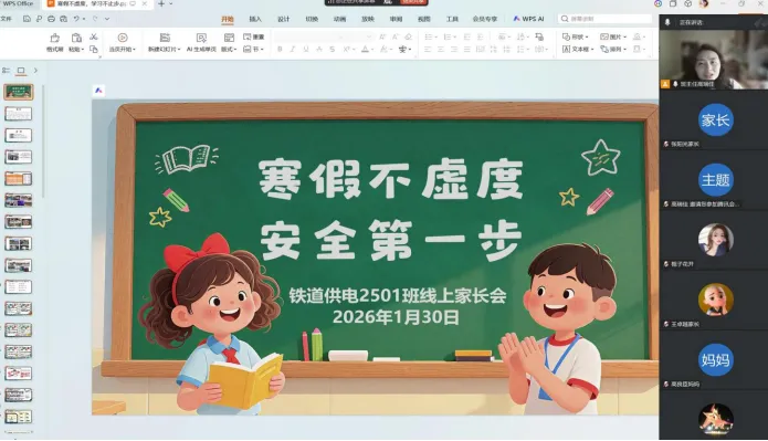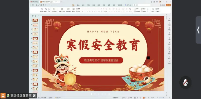 1月20 日,铁道供电2501班组织全体学生召开线上“春节”安全教育主题班会,班会由班主任高瑞佳主持。会上,高老师围绕春节期间出行安全、用火用电规范、防范电信网络诈骗等重点环节,结合真实案例与警示视频,系统讲解了交通安全、火灾预防、网络安全及个人防护等方面知识,引导学生主动识别风险、增强自我保护意识,进一步巩固安全防范知识与应急技能,时刻牢记“平安过节、安全第一”,在返乡、出行和日常生活中自觉落实安全要求,确保个人与家庭度过一个祥和、安全的春节假期。