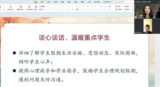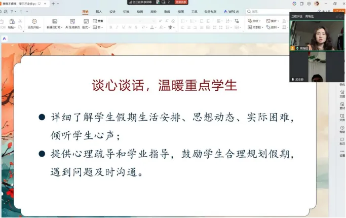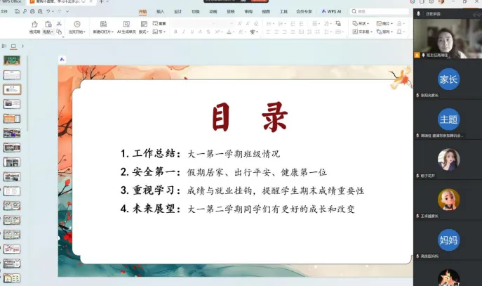 1月30 日,铁道供电2501班组织全体学生家长召开“假期不虚度、安全第一步”线上家长会,班会由班主任高瑞佳主持。会上,高老师围绕本学期班级整体情况、学生在校表现进行总结汇报,就如何利用寒假时间与学生深入交流、规划就业发展提出了建议,重点围绕以下3项事宜恳请家长配合:一是抓牢安全教育,守护学生平安;二是重视专业成绩,做好就业规划;三是搭建共育桥梁,护航学生成长。家长反响积极,表示将积极配合学校,共同保障学生度过一个平安、充实的假期。