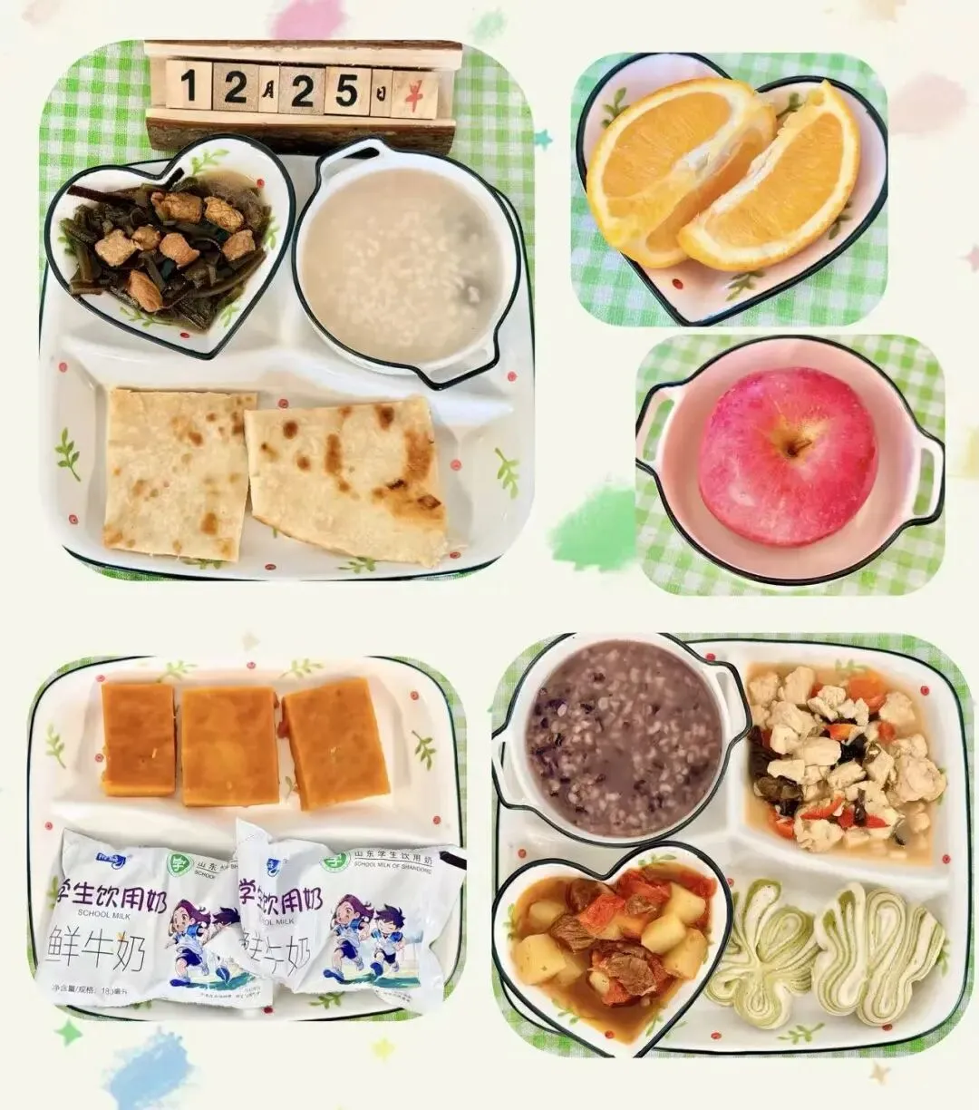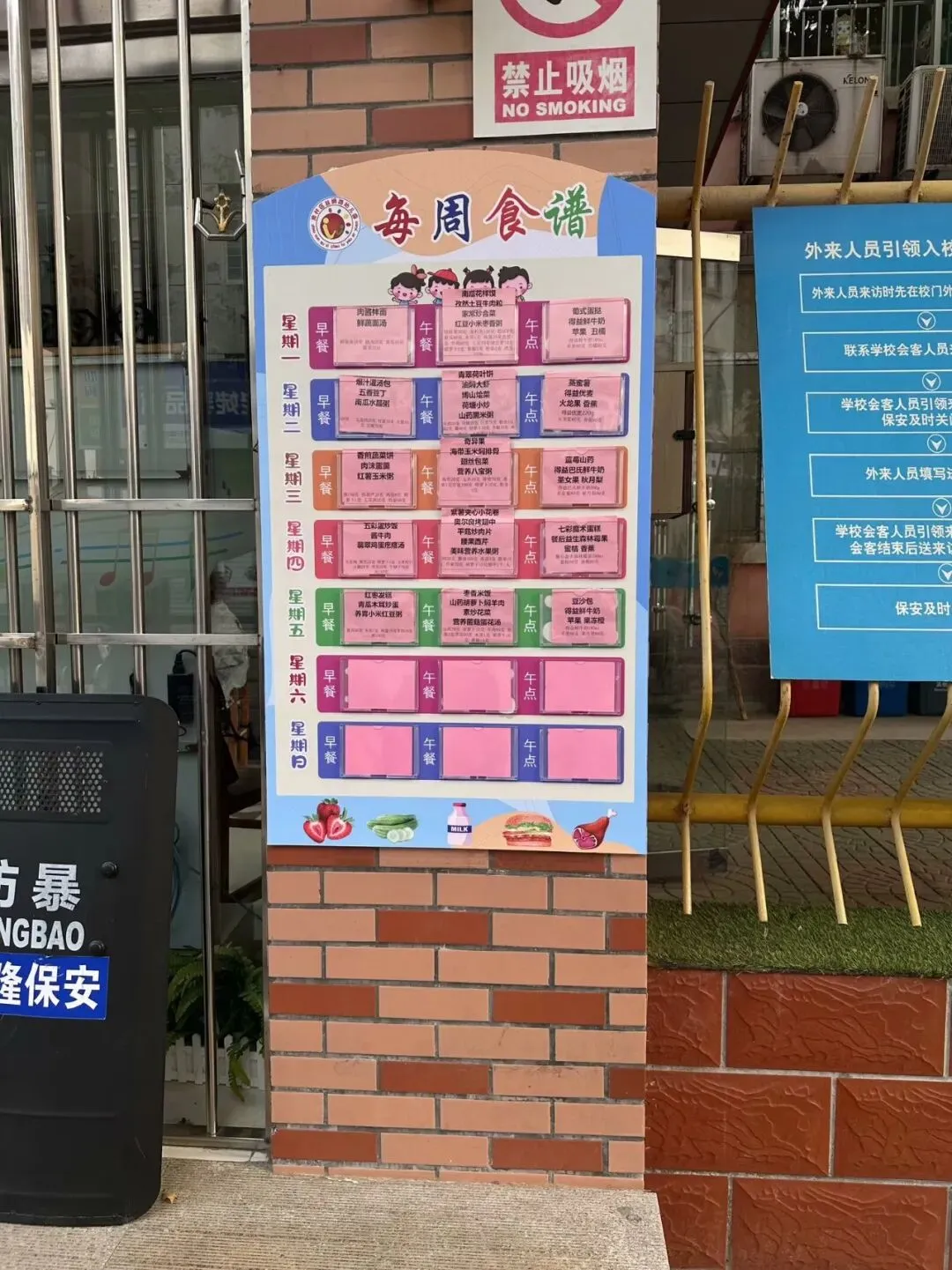 每周通过公众号公布当周食谱,纸质也会在幼儿园门口公示栏显现,以供各位家长查看。