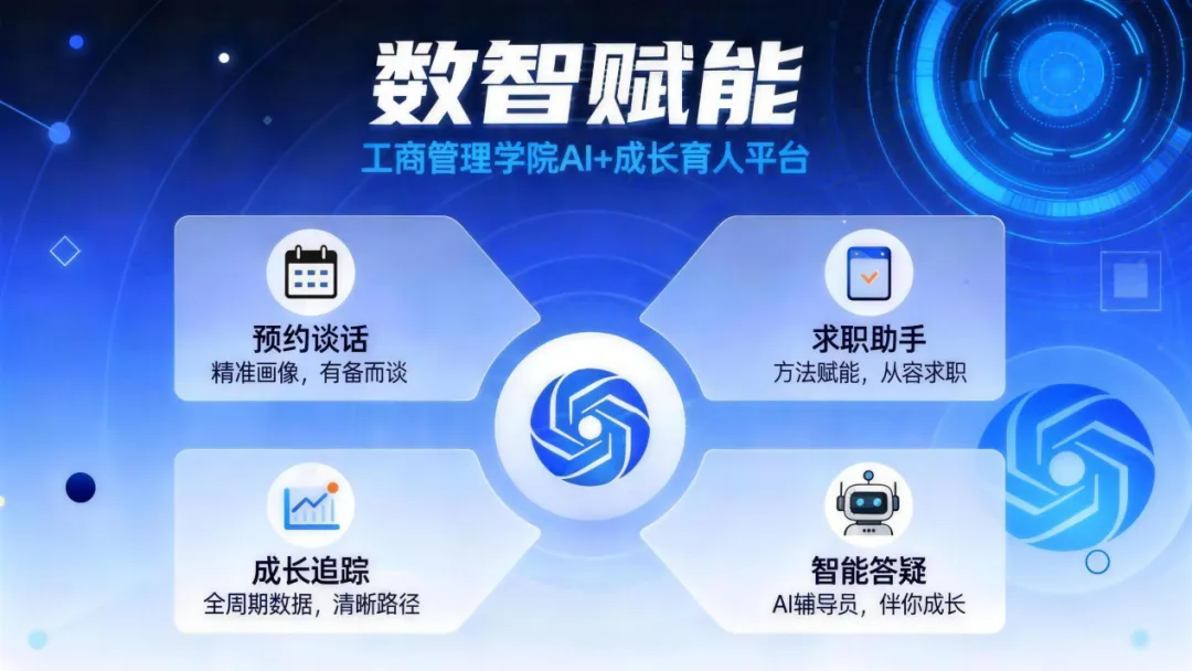 积极响应数智时代育人变革,学院自主研发“数智赋能”平台,集“预约谈话”“求职助手”“智能答疑”“成长追踪”等功能于一体。平台通过整合学生学业成绩、竞赛参与、实习经历等多维数据,生成个性化成长报告,为师生谈心、职业规划提供数据支撑;“AI求职助手”可实现简历智能诊断、模拟面试反馈等全流程服务,显著提升学生求职效率;“AI辅导员”7×24小时在线解答就业、科创、奖学金、资助等高频问题,打破信息壁垒。平台自上线以来,已成为同学们贯穿大学生涯的“数字成长伙伴”。