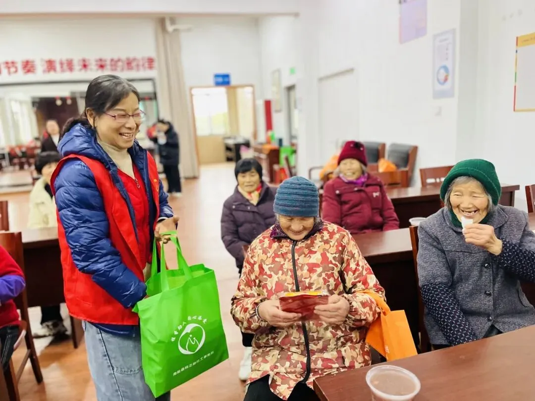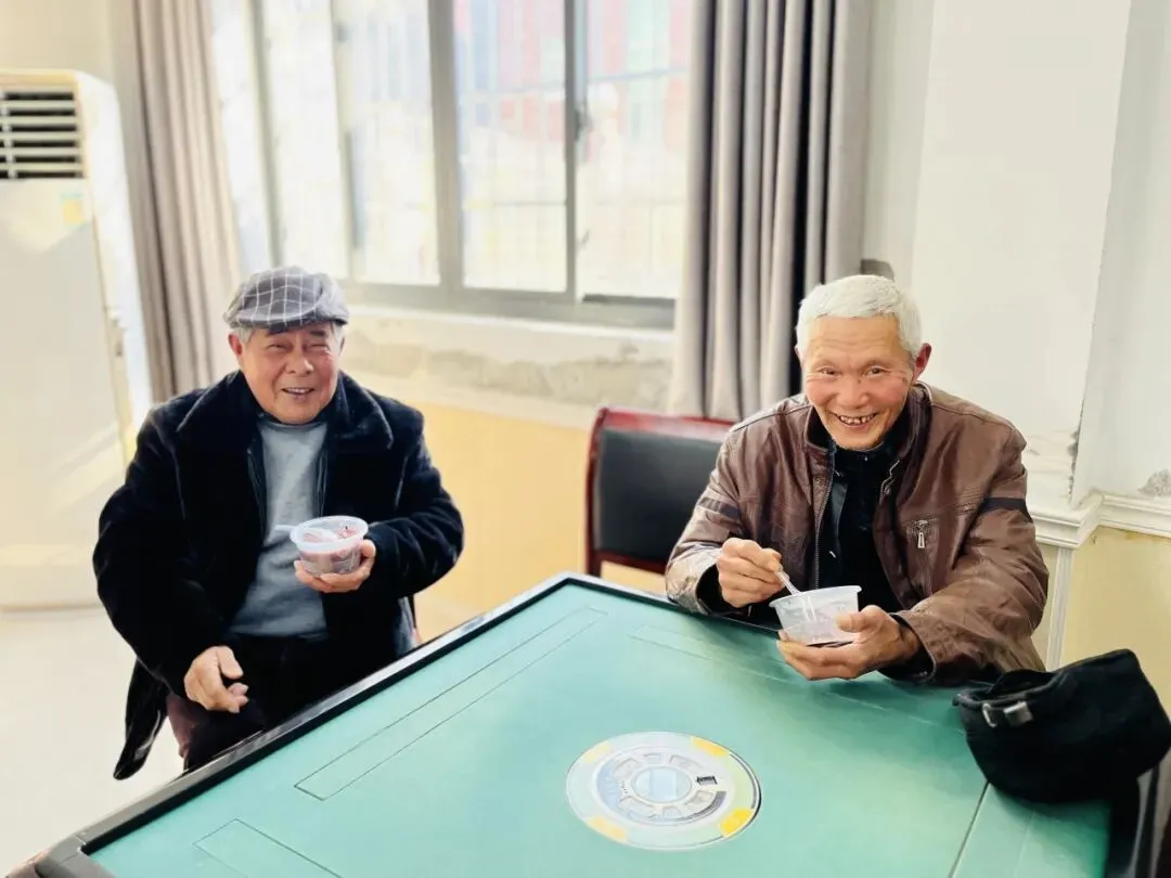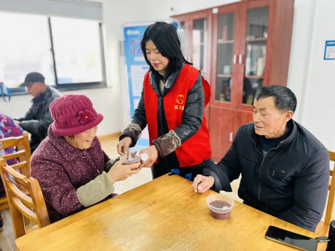 (2)1月19日,于城镇鸳鸯村联合海盐县桂之韵社工事务所举办的以“粥香暖腊八 新历启福年”为主题的腊八节活动温情启幕,居家养老服务中心内张灯结彩,暖意融融,中心工作人员用传统民俗与贴心关怀,为老人们提前勾勒新春的美好图景。