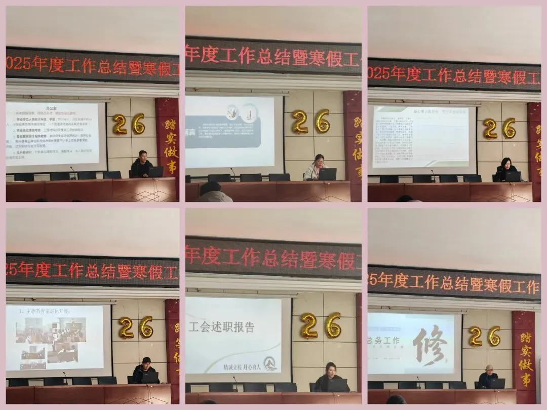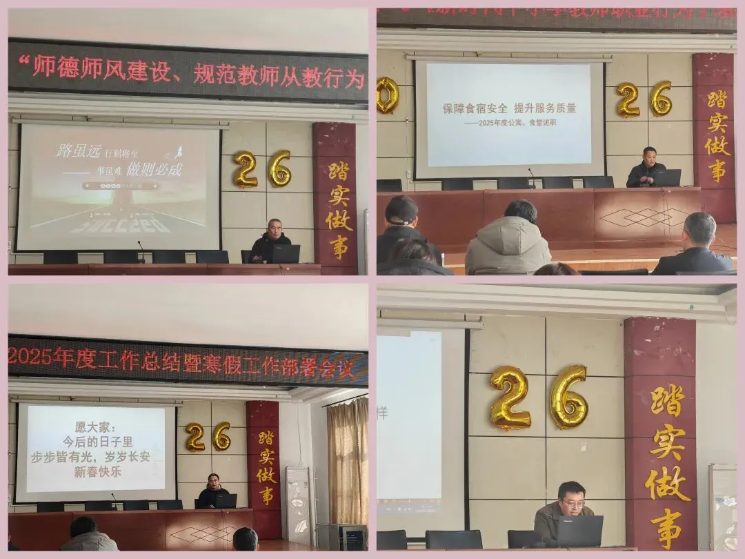 教科研主任张小波以课题研究、教师专业成长为核心,汇报了以研促教的进展与成效;团支部书记蔺艳艳聚焦青年教师培养与学生思想引领,展现了共青团组织的活力与担当;公寓餐厅主任何志军围绕师生食宿安全、服务优化,详述了后勤保障的精细化管理;安全办主任黎凯从校园安全防控、隐患排查、应急处置等方面,压实了安全工作的责任链条;督导室主任郭海瑞、财务部主任王建民、体卫艺主任王燕、心育室主任马秋云、电教室主任尹明也分别结合各自职责,全面复盘了年度工作中的亮点成效、存在不足及改进方向,为学校后续发展提供了清晰的思路支撑。