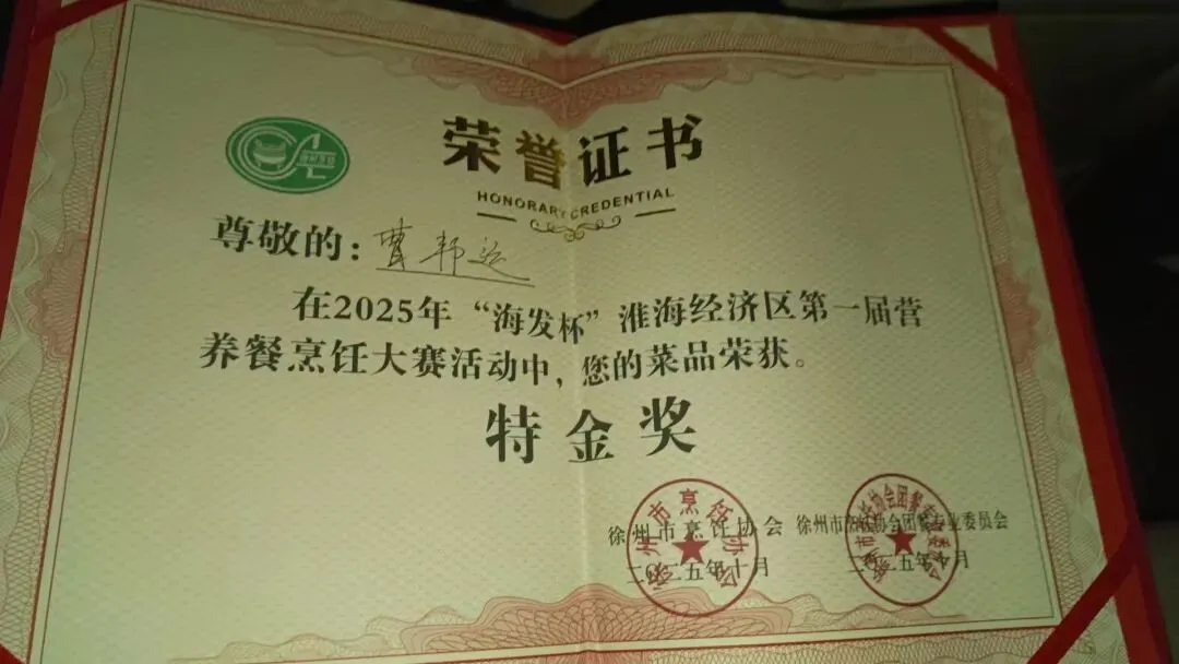 在成本管控方面,建立精细化核算体系,每周分析食材价格波动情况,优化采购方案;严格控制食材损耗,推行“按需采购、精准加工”模式,在人员管理方面,完善绩效考核制度,将服务态度、工作效率、食品安全等指标纳入考核,激发工作人员积极性;组织技能培训16场,涵盖烹饪技巧、服务礼仪、设备操作等内容,提升团队专业素养,工作人员持证上岗率、技能考核通过率均达100%。2025年“海发杯”第一届营养餐烹饪邀请赛我校厨师曹帮运一举夺得特别金奖。