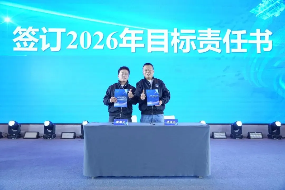 2026年目标责任书签订环节如期举行,将年度发展目标层层分解、责任到人。第一轮,董事会与经理层签订2026年目标责任书,锚定核心发展方向,压实经营管理责任;第二轮,总经理陆汪先后与营销中心、战略投资中心、财务中心、技术研发中心等十一个中心及重大项目专班签订目标责任书。一纸责任书,既是沉甸甸的承诺,更是实打实的担当,标志着环天智慧2026年各项工作全面启动,全体同仁将以“言出必行、行则必果”的执行力,全力以赴冲刺年度目标。