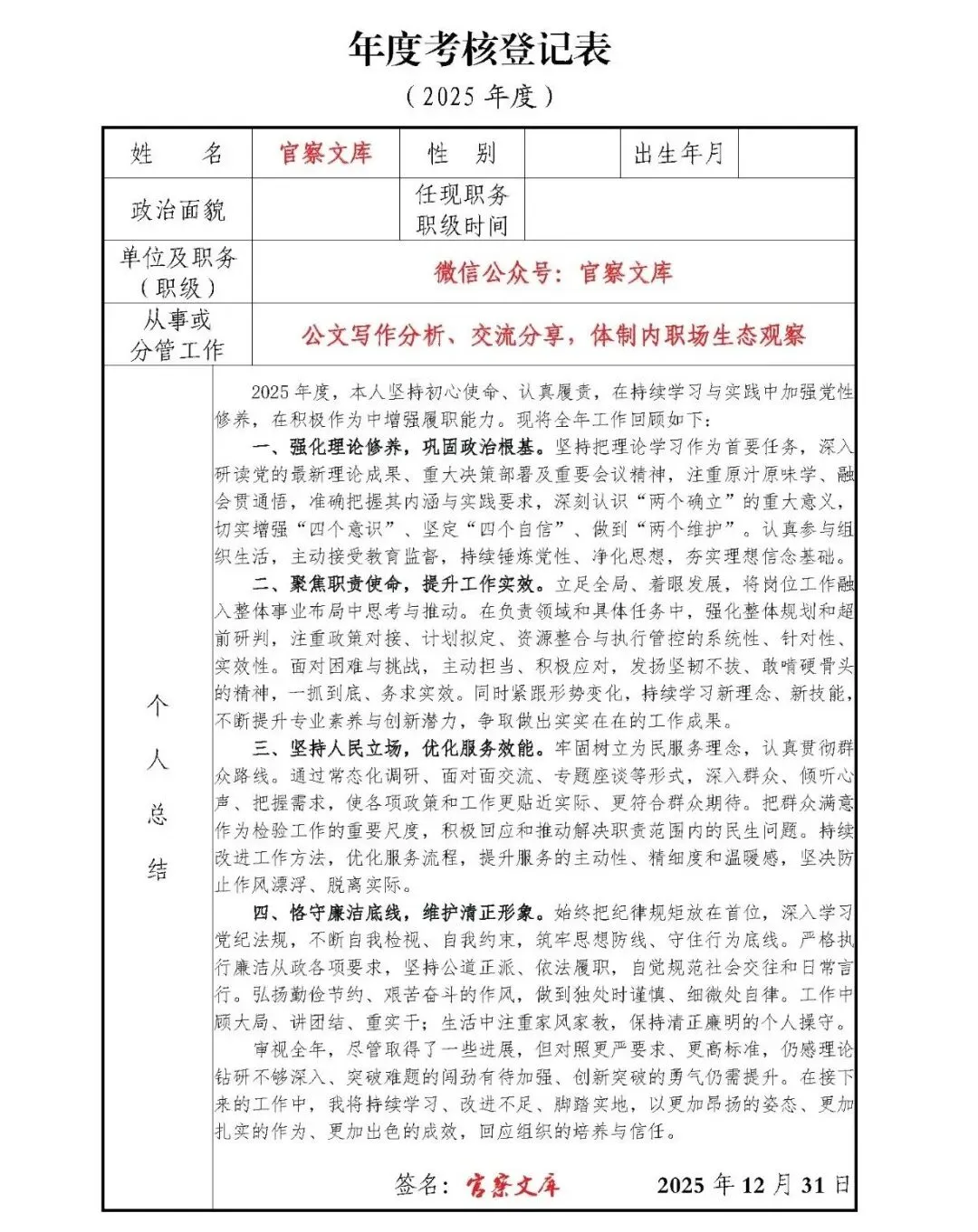 四、恪守廉洁底线,维护清正形象。始终把纪律规矩放在首位,深入学习党纪法规,不断自我检视、自我约束,筑牢思想防线、守住行为底线。严格执行廉洁从政各项要求,坚持公道正派、依法履职,自觉规范社会交往和日常言行。弘扬勤俭节约、艰苦奋斗的作风,做到独处时谨慎、细微处自律。工作中顾大局、讲团结、重实干;生活中注重家风家教,保持清正廉明的个人操守。