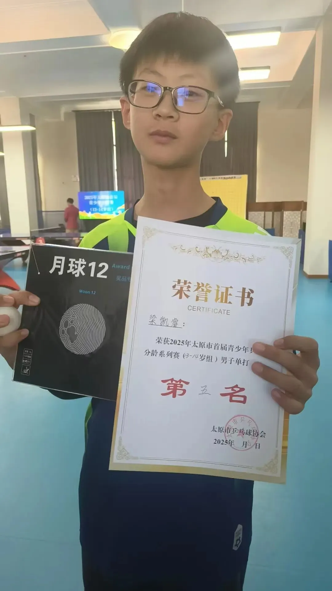 1.太原乒协分领段乒乓球比赛(11月24日):学员梁凯睿在13-14岁组别中凭借扎实的技术与稳定的发挥,一路过关斩将,最终斩获第五名的优异成绩,为机构赢得首份赛事荣誉。 2.晋源区中小学生乒乓球比赛(12月10日):机构共派出13名学员参赛,分别加入4支团体队伍,助力所在学校斩获佳绩: