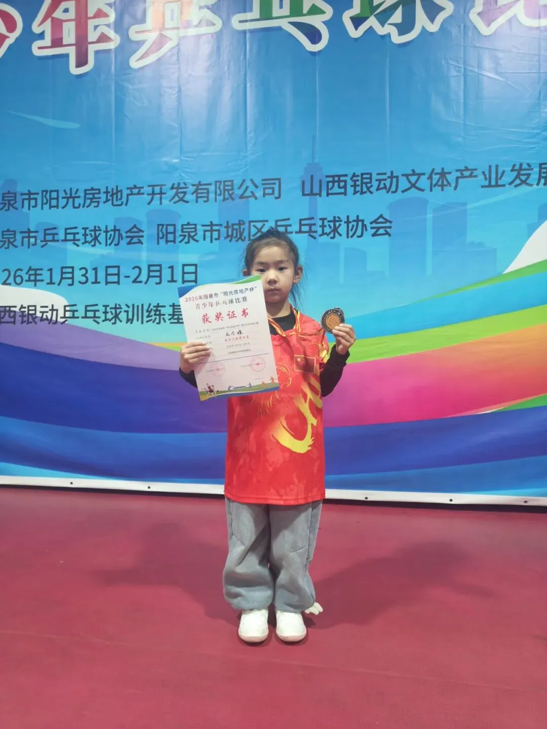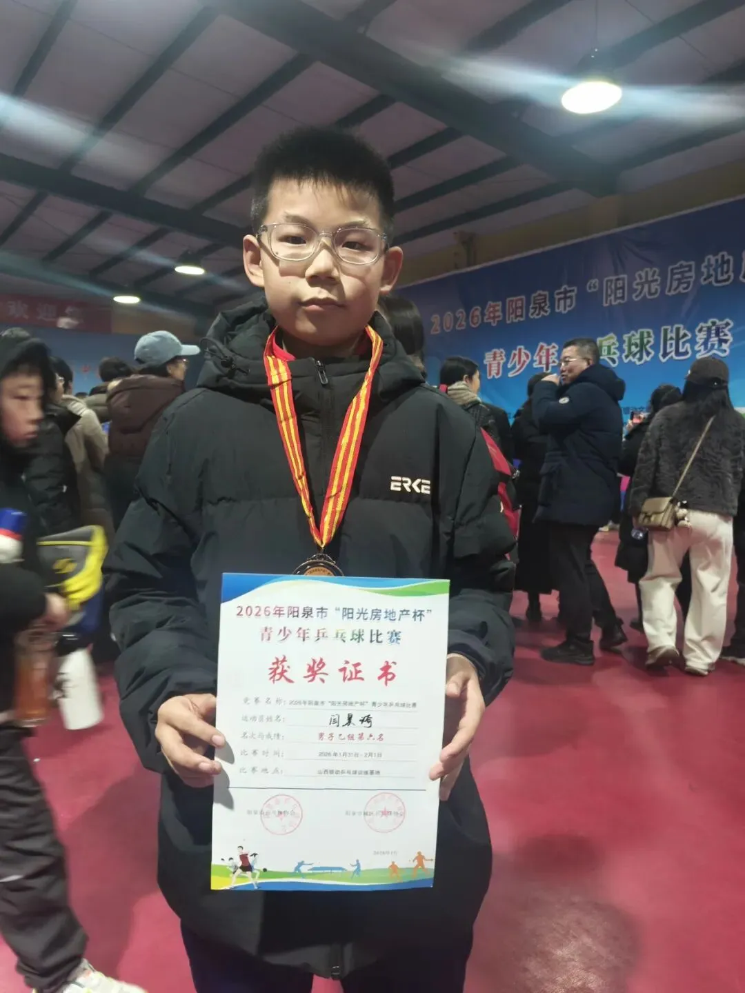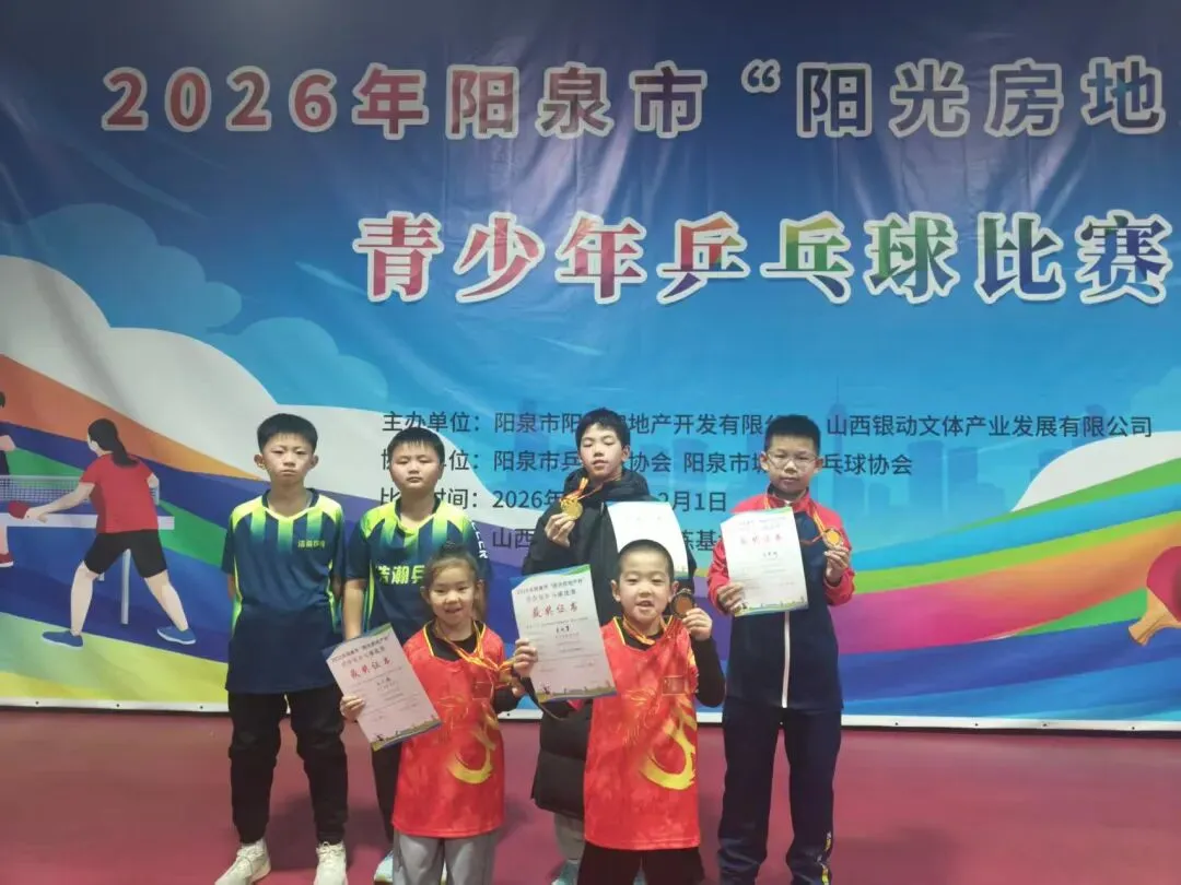 ○花塔小学参赛队5名队员中4名来自浩瀚乒乓,团体荣获第五名; ○晋源区实验小学参赛队5名队员中3名来自浩瀚乒乓,团体荣获第六名; ○晋泽中学小学部参赛队5名队员全部为浩瀚乒乓学员,团体荣获第八名。 3.阳泉乒协青少年乒乓球公开赛(2026年1月31日):机构派出8名小将征战多个组别赛场,学员们顶住压力、敢打敢拼,斩获多项个人荣誉: