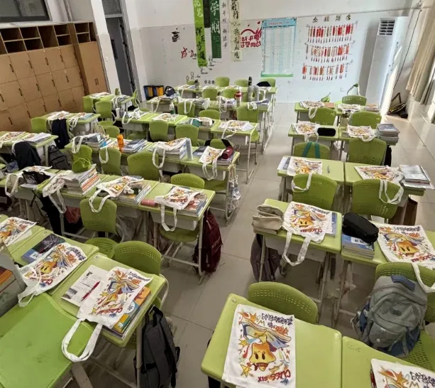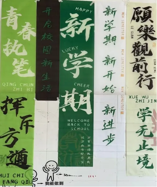本学期,学生步入九年级,为了迎接学生,缓解入校的不适,我和几位学生一起给学生准备的丰富的开学仪式。准备的不仅有文具,饮料和标语横幅,苑睿珊同学还设计了属于班级专属的图案,印在了帆布袋子上。希望新学期,新开始,学生可以以青春执笔,挥斥方遒。