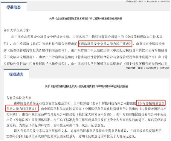 2025年2月,由全国检验检测认证职业教育集团牵头申报的《药品质量安全负责人能力通用要求》与《医疗器械质量安全负责人能力通用要求》两项团体标准立项。12月,标准工作组已形成并发布了征求意见稿,面向社会公开征求意见。