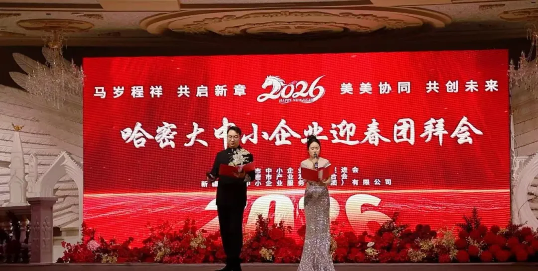 会议第一阶段在圆满完成各项议程后结束后,与会人员共同参加了主题为“马岁程祥·共启新章,美美协同、共创未来”迎新春团拜活动。活动以“团圆、奋进、祥和”为主线,通过光影艺术、文艺汇演、荣誉表彰、幸运抽奖、福利发布及团圆祝酒等环节,隆重而热烈,充分展现了哈密市企业家群体团结协作、昂扬向上的精神风貌,凝聚了共谋“十五五”高质量发展的强大合力。