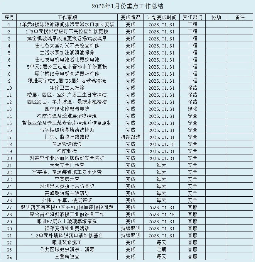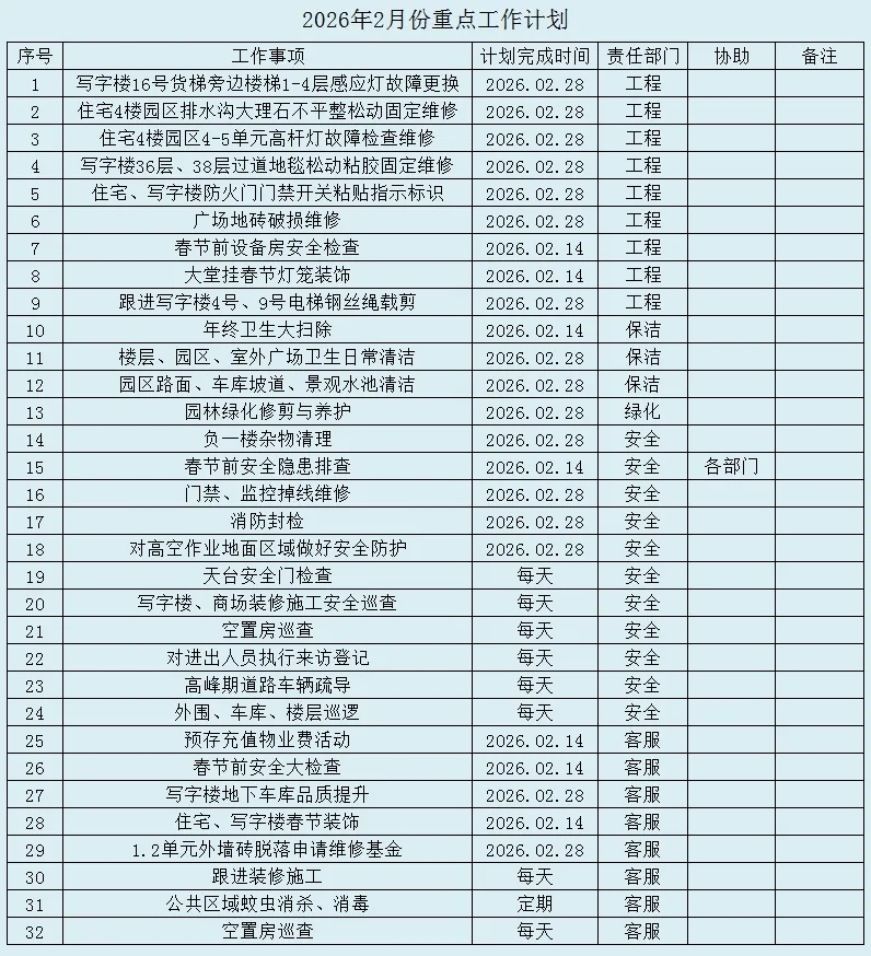 金鞍辞旧岁,骏马踏春来!为了更好地提升物业服务品质,让您更加及时地了解我们的工作,在此,荣灿物业服务中心为您献上一月份的工作报告。二月,我们将继续努力提升服务品质,营造一个优美、舒适、安全、文明的环境。