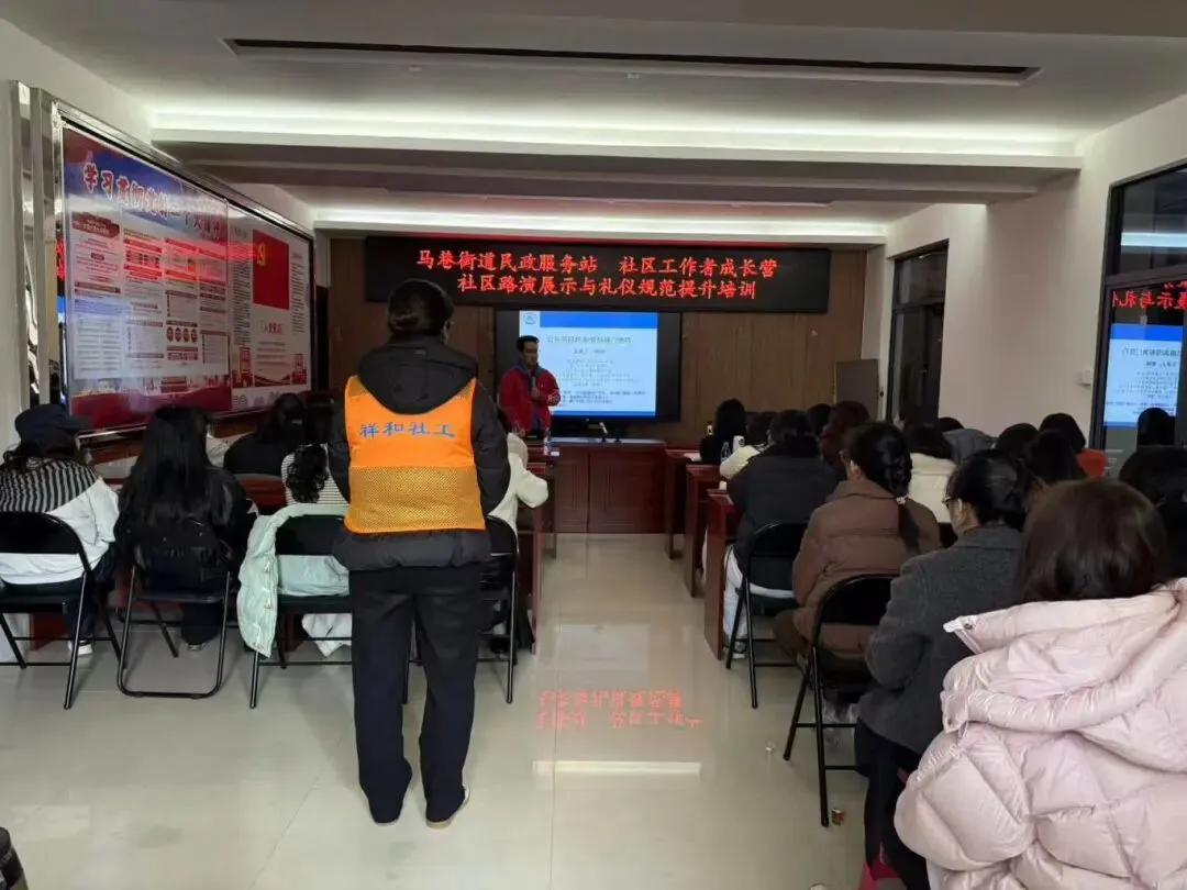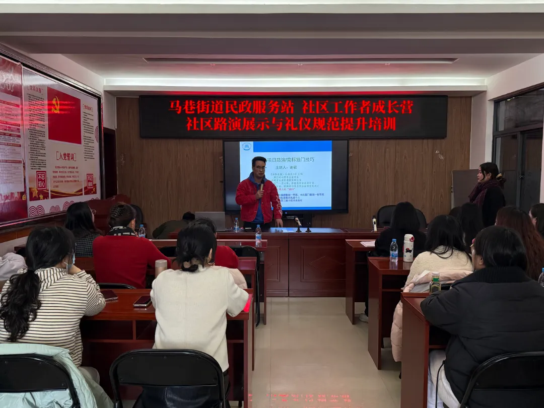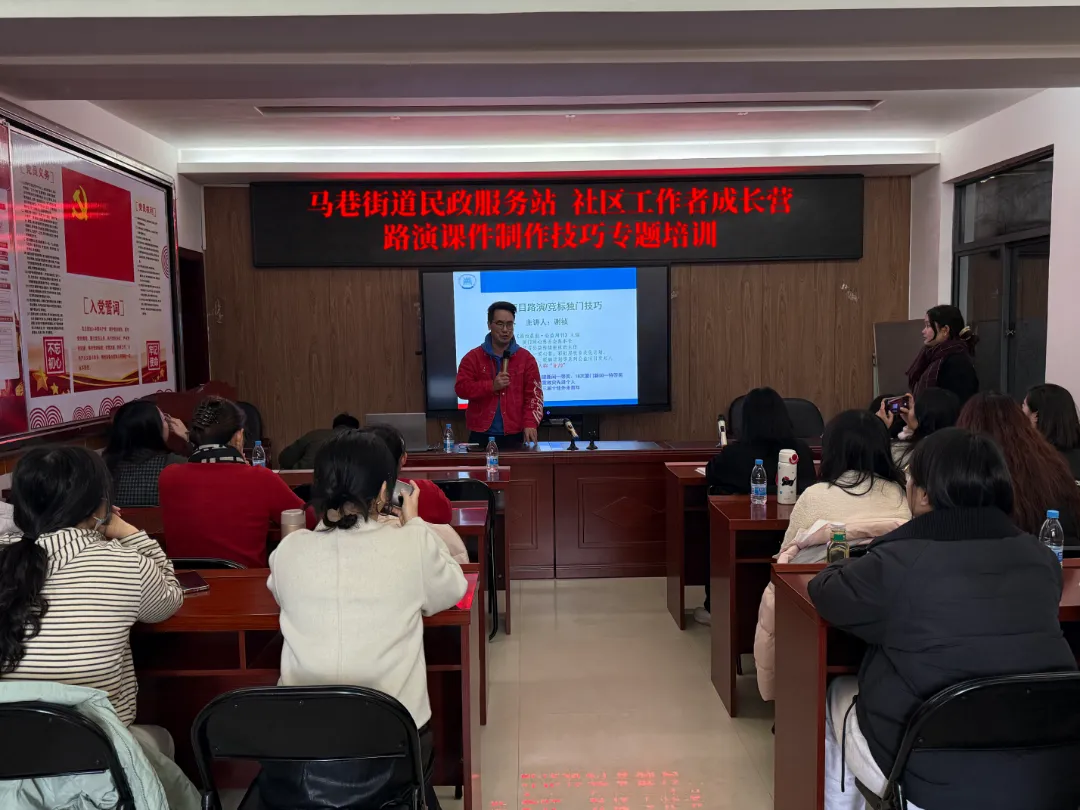 继路演课件制作技巧培训后,2026年月1日9日下午,在翔安区民政局的指导与马巷街道的支持下,马巷街道民政服务站继续组织开展了“社区工作者成长营——路演展示与礼仪规范提升培训”活动。活动邀请《海西晨报·公益周刊》主编、对外传播部主任、福建省公益传播班班主任、厦门同心慈善会监事长谢祯老师主讲,以实战案例为核心,助力社区工作者提升公益项目路演竞争力。