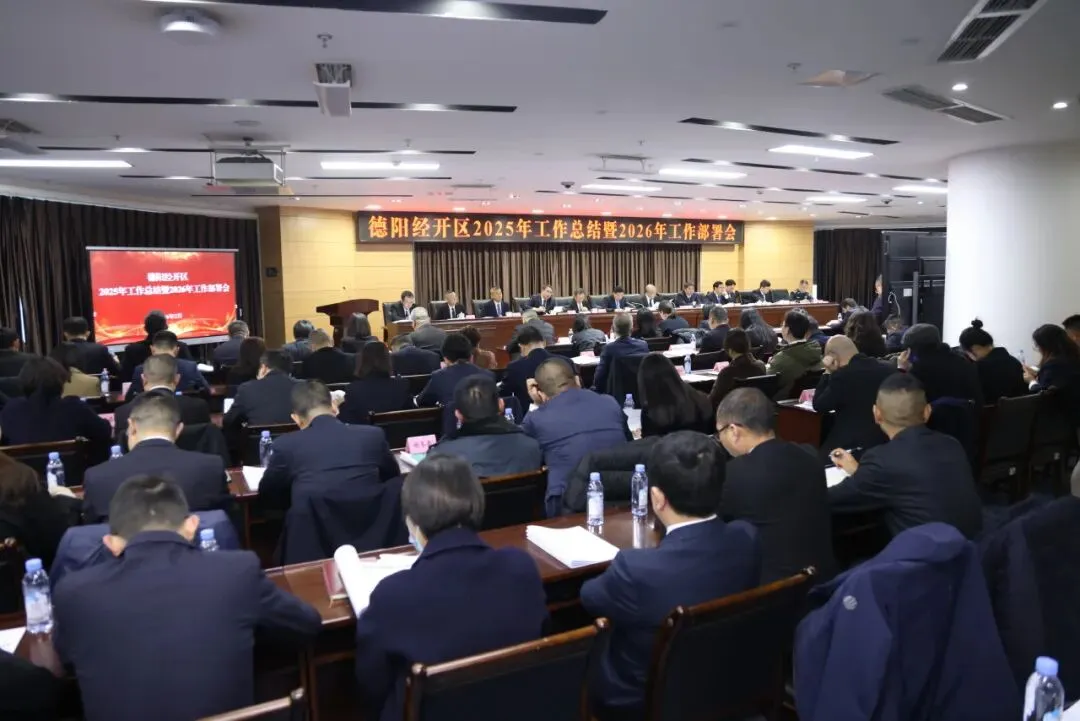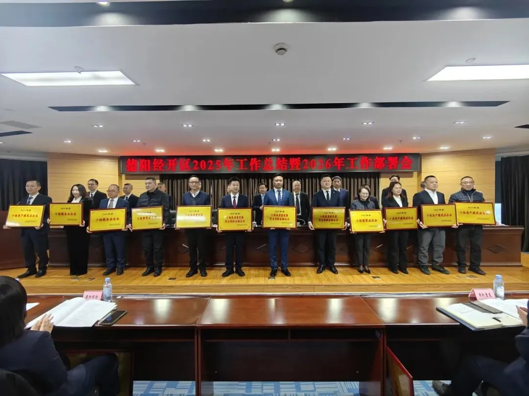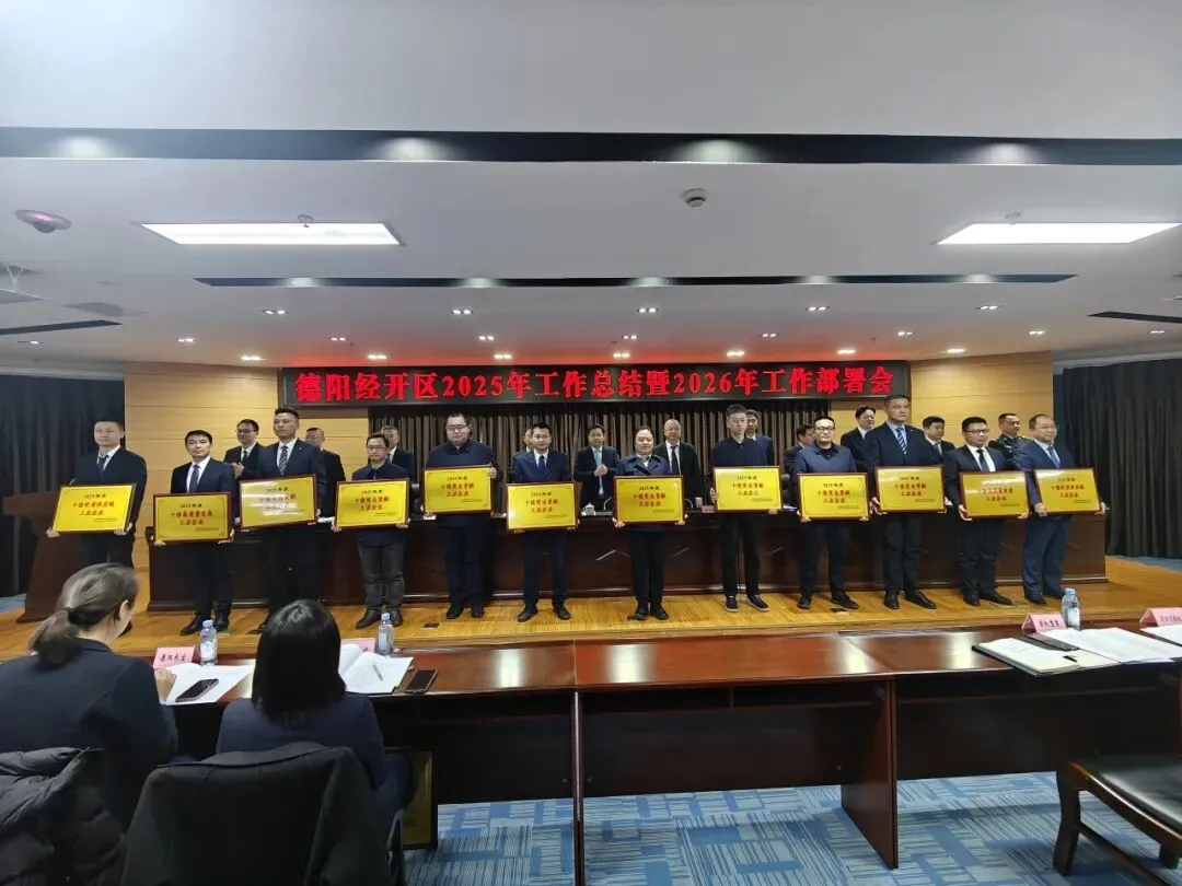 会议传达学习中省市相关会议精神,通报2025年度重点目标任务及重大项目完成情况,德阳经开区发改统计局、工信科技局、财政局、投促局、八角井街道等单位作交流发言,表扬2025年度优秀企业并举行颁奖仪式,全面总结“十四五”及2025年发展成果,明确2026年“十五五”开局之年的发展方向。