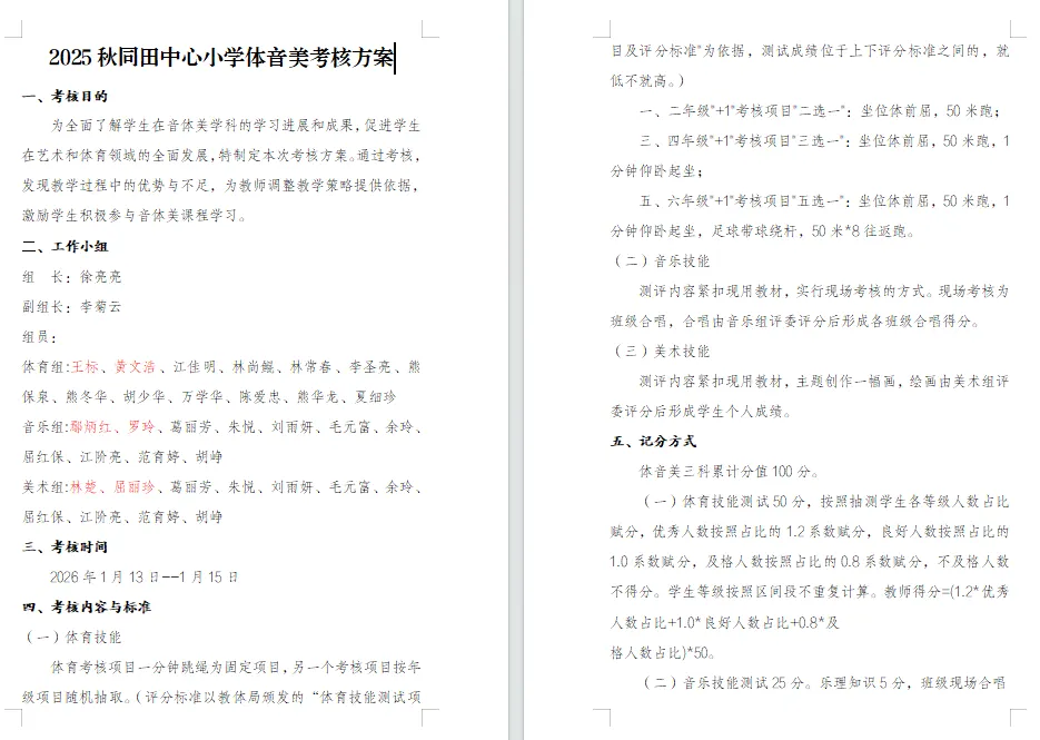 2.完成体音美学科考核工作:1月12-15日制定体音美考核方案,统筹组织中心校及各村小体音美测试,1月16日完成测试结果汇总。