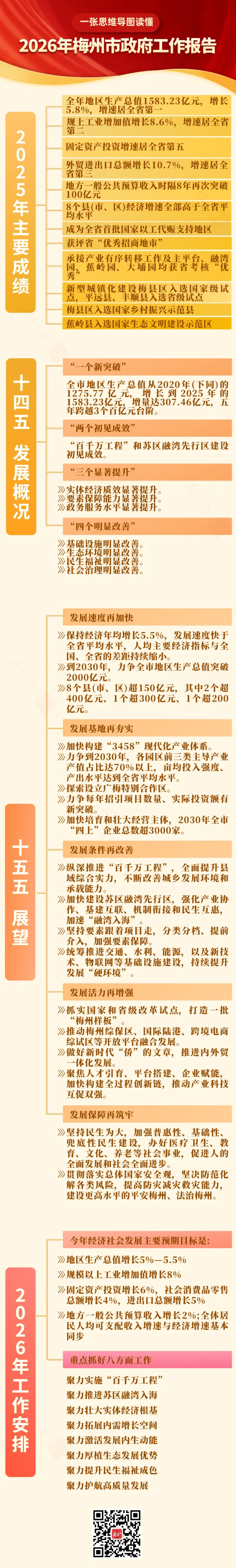 2025年梅州主要工作和“十四五”发展主要成绩有哪些?2026年工作如何安排?南方+制作可视化思维导图,清晰梳理报告核心要点。