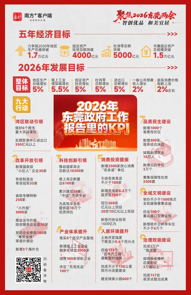 社消零总额增长5%、进出口总额增长5%、实现空港中心进出口350亿元以上、为高校毕业生提供超10万个优质岗位、新增路外公共停车位不少于6万个……未来五年东莞有哪些KPI、2026年东莞要怎么做?一张海报带你了解→
