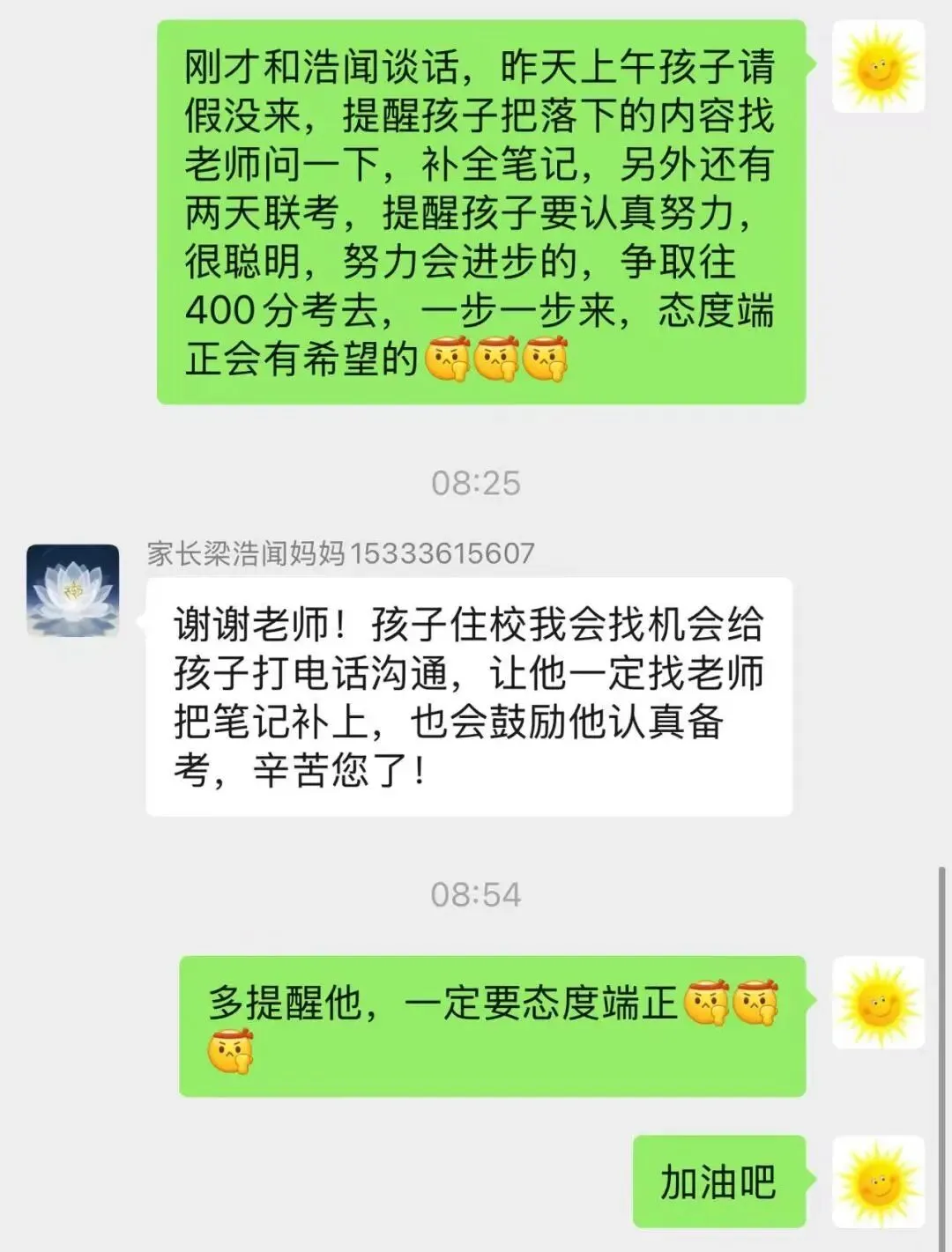 对田耀琛:“马上要联考,自己要多上心…上次月考比期中考试倒退了…上课提高课堂效率,背诵要跟上,最近三天好好努力。”(家长回应:“加油”)