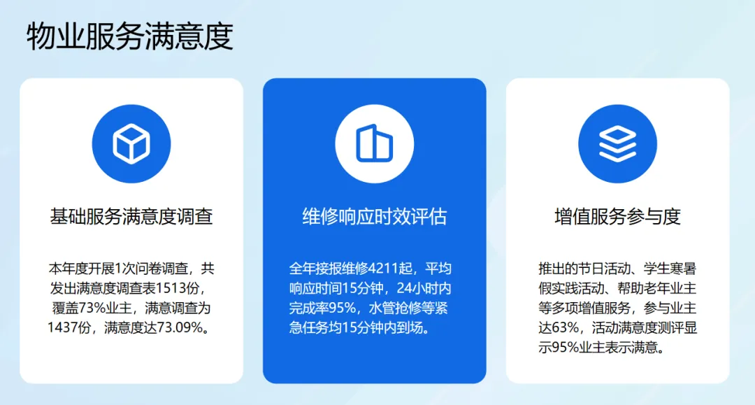 对物业公司日常工作的督导,组织了物业公司向业主代表汇报三年来(2023-2025年)的工作及对未来两年工作的计划,并通报业主满意度调查的结果。