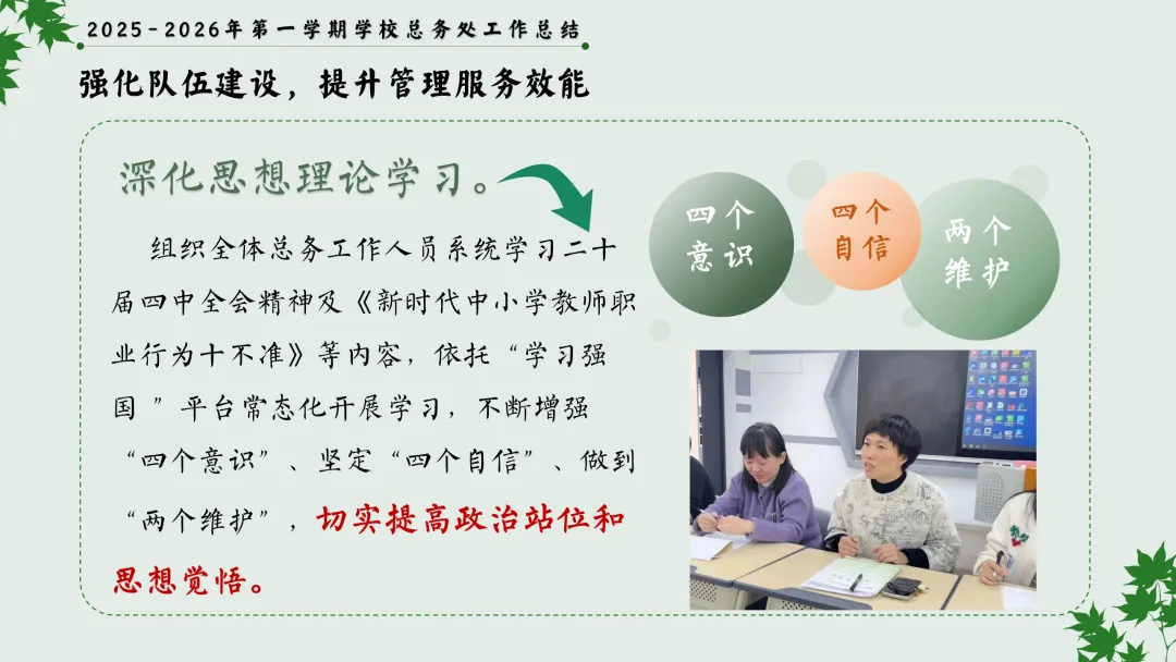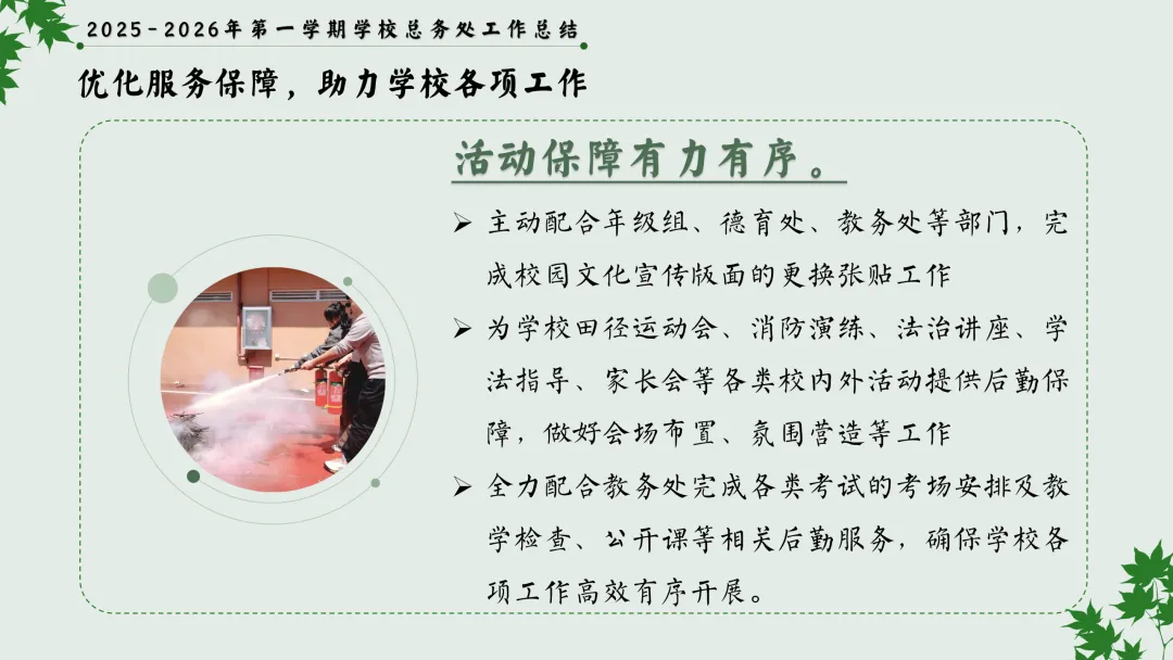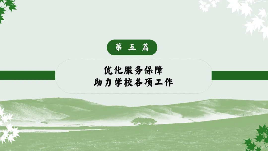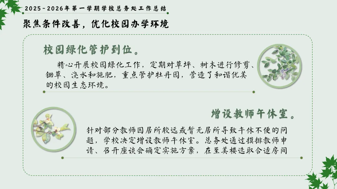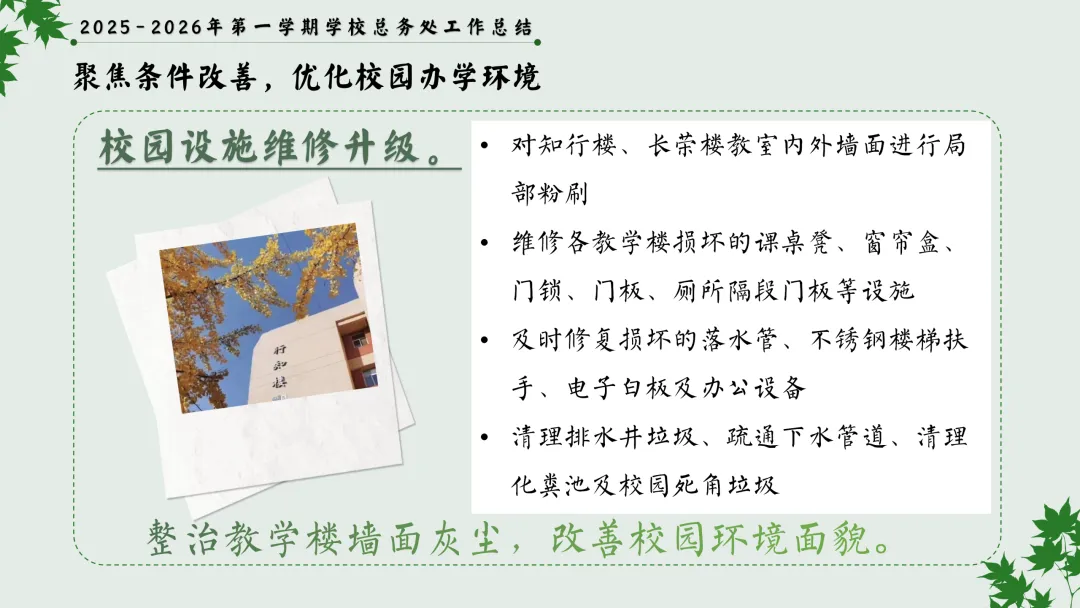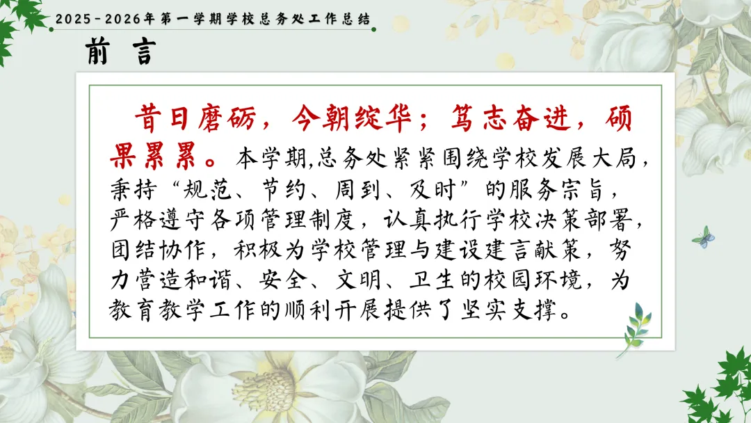 昔日磨砺,今朝绽华;笃志奋进,硕果累累。本学期,总务处紧紧围绕学校发展大局,秉持“规范、节约、周到、及时”的服务宗旨,严格遵守各项管理制度,认真执行学校决策部署,团结协作,积极为学校管理与建设建言献策,努力营造和谐、安全、文明、卫生的校园环境,为教育教学工作的顺利开展提供了坚实支撑。